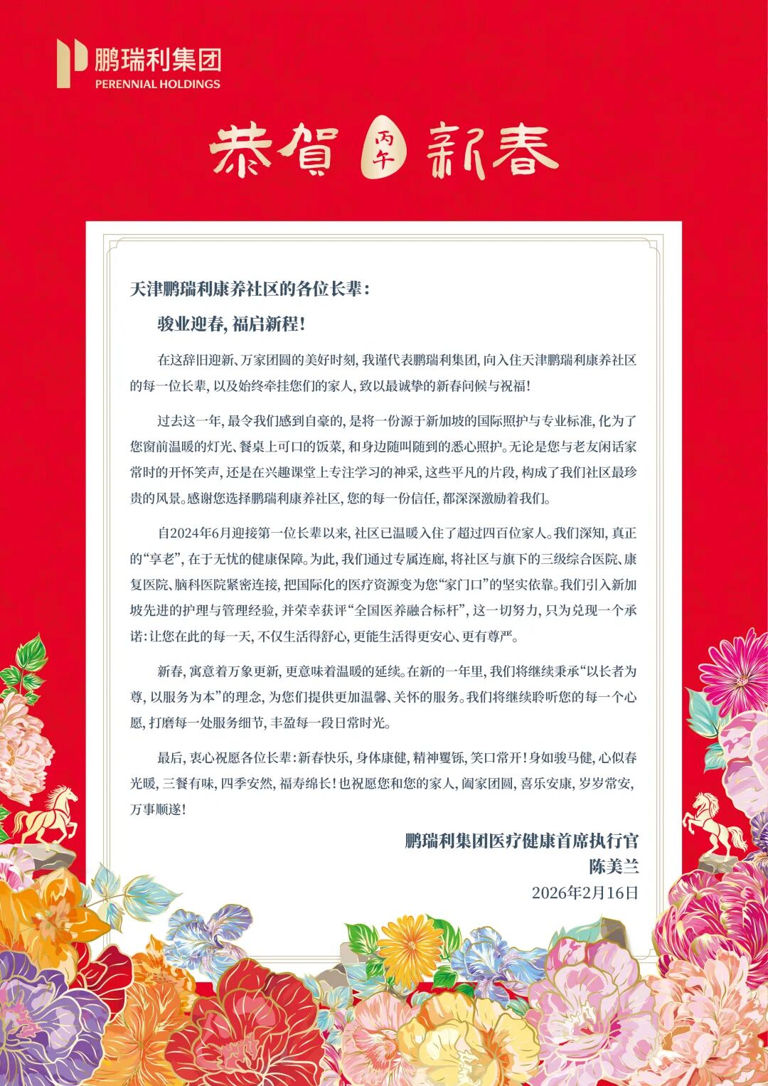 丙午新岁·福寿安康|鹏瑞利集团医疗健康首席执行官陈美兰女士致天津鹏瑞利康养社区长辈的一封信