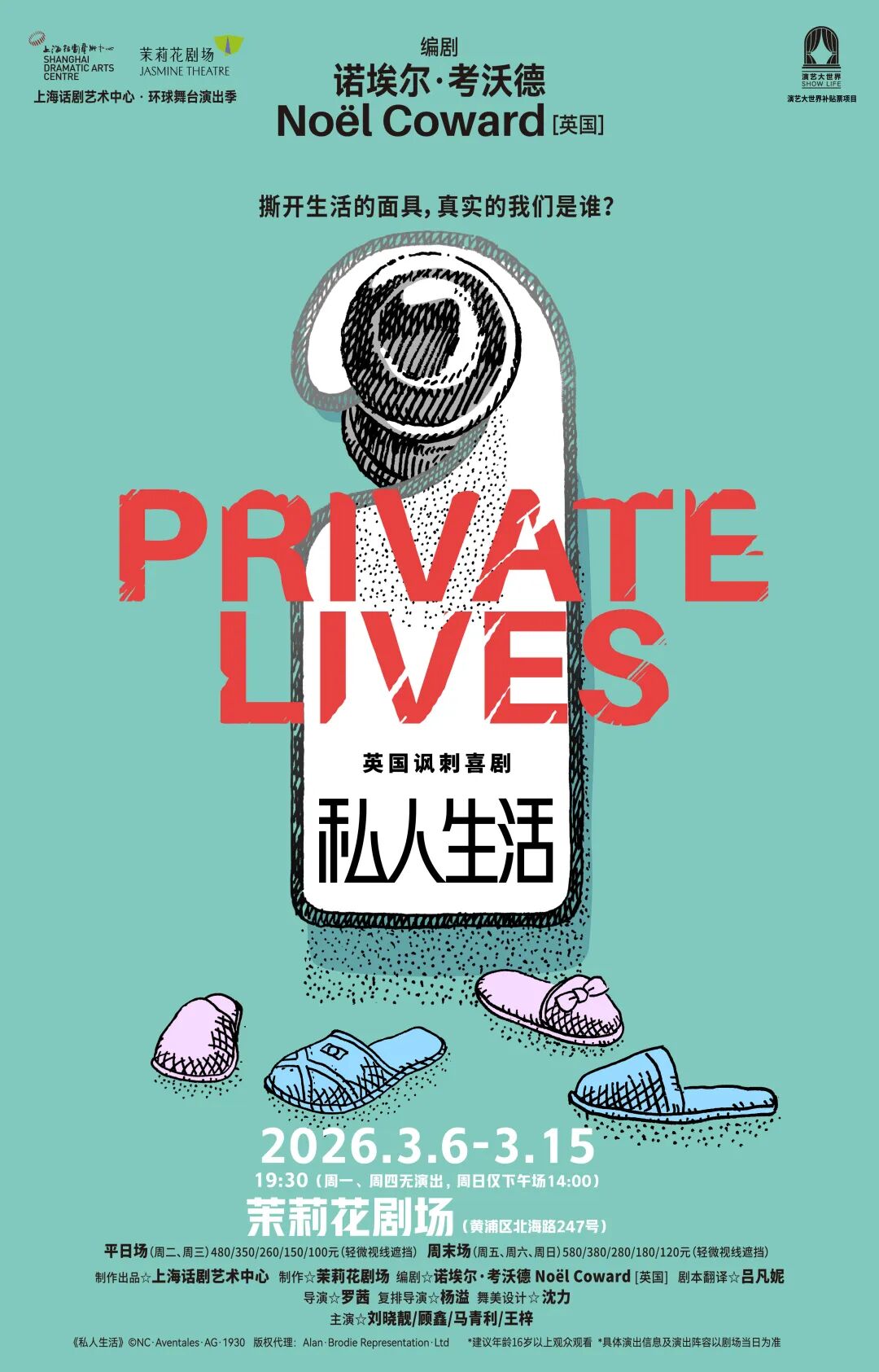 制作出品:上海话剧艺术中心 | 制作:茉莉花剧场 | 出品人:张惠庆 | 总监制:田水 | 艺术总监:喻荣军 | 联合监制:何念 | 总制作人:吴嘉 | 制作人:杨丽娟 | 编剧:诺埃尔·考沃德 Noël Coward [英国] | 剧本翻译:吕凡妮 | 文学统筹:武轶文 | 导演:罗茜 | 复排导演:杨溢 | 舞美设计:沈力 | 灯光设计:朱雨双 | 服化设计:毕文宗 | 道具设计:朱晨祺 | 音效设计:王轶轩 | 编曲:李柯萱 | 编舞:程遥 | 技术设计/舞美制作监理:赵明 | 技术总监:罗霁忺 | 舞台监督:蔡雁群