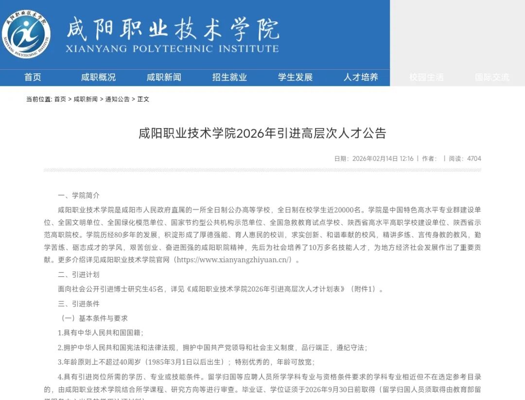 咸阳职业技术学院2026年招聘事业单位工作人员45人