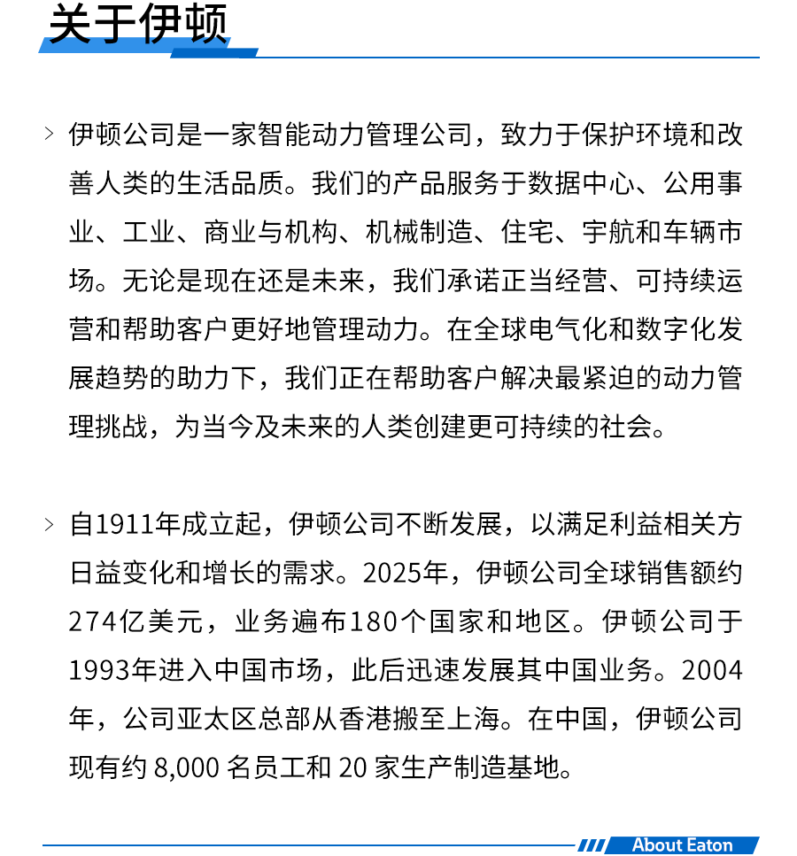 “这一成就彰显出我们携手共进所凝聚的强大势能,我们始终将客户置于一切工作的核心,持续推动创新与新技术的应用,助力应对全球最复杂的动力管理挑战,从而驱动未来增长与发展机遇。伊顿致力于不断超越客户、投资者、员工等所有利益相关方的期望,此次荣誉正是对我们阶段性成果的高度认可。”