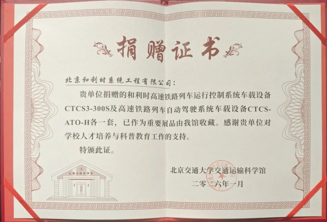 近日,为加强与北京交通大学的交流合作,共同推动轨道交通领域的科技创新与人才培养,和利时向“北京交通大学交通运输科学馆”(国家级科普教育基地)捐赠列控核心设备。此次捐赠的CTCS3-300S高速铁路列车运行控制系统车载设备及高速铁路列车自动驾驶系统车载设备CTCS-ATO-H,旨在将前沿列车运行控制技术转化为优质科普资源,构建人才培养体验新窗口。