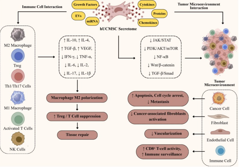 脐带间充质干细胞外泌体并非单一途径作战,而是通过多因子、多通路的协同调控,在慢性炎症和癌症治疗中发挥精妙的“分子战争”。