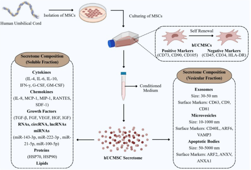 特别是在今年最新的综述《Therapeutic applications of human umbilical cord-derived mesenchymal stem cell secretome in chronic inflammatory diseases and cancer: A recent update》中[1],研究人员详细阐述了脐带间充质干细胞外泌体(hUC-MSC-EVs)在治疗慢性炎症性疾病乃至癌症(包括癌症、炎症性肠病、类风湿关节炎和神经退行性疾病等)中的巨大潜力。