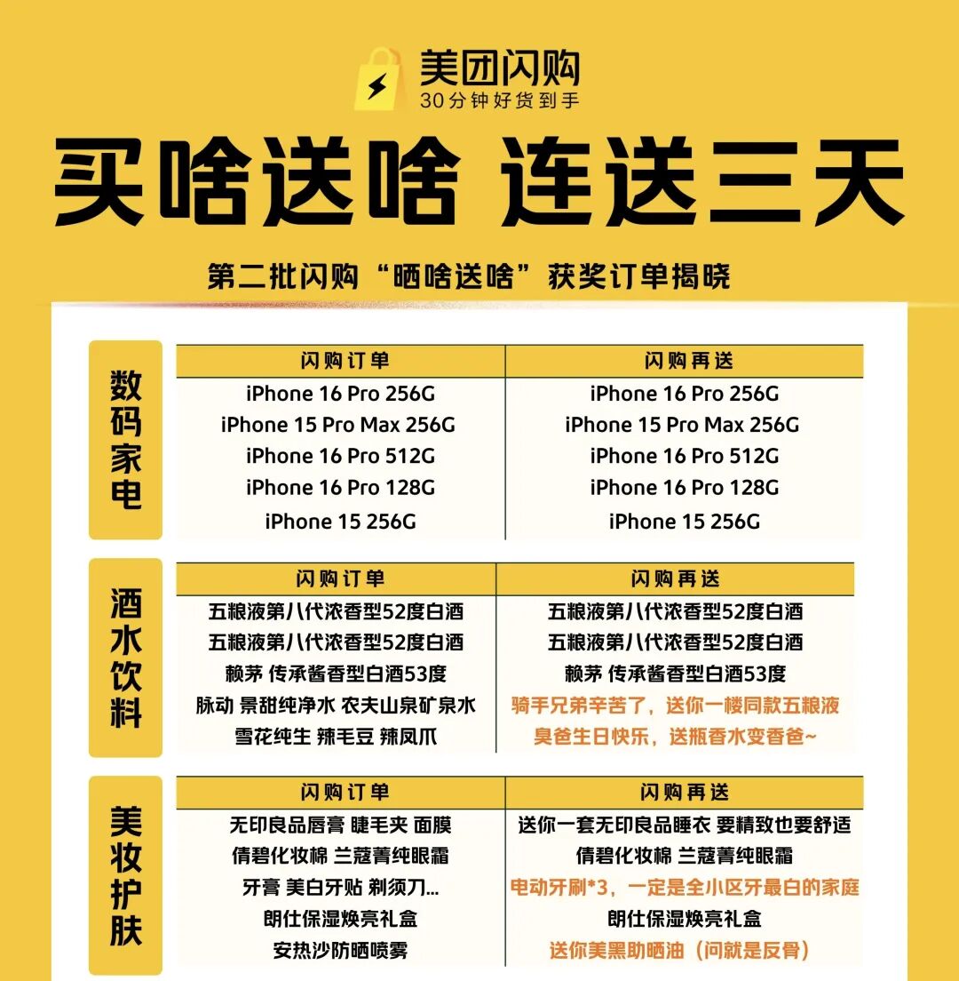来看看截至4月17日14:00,第二批闪购"晒啥送啥"开奖榜单都有啥——