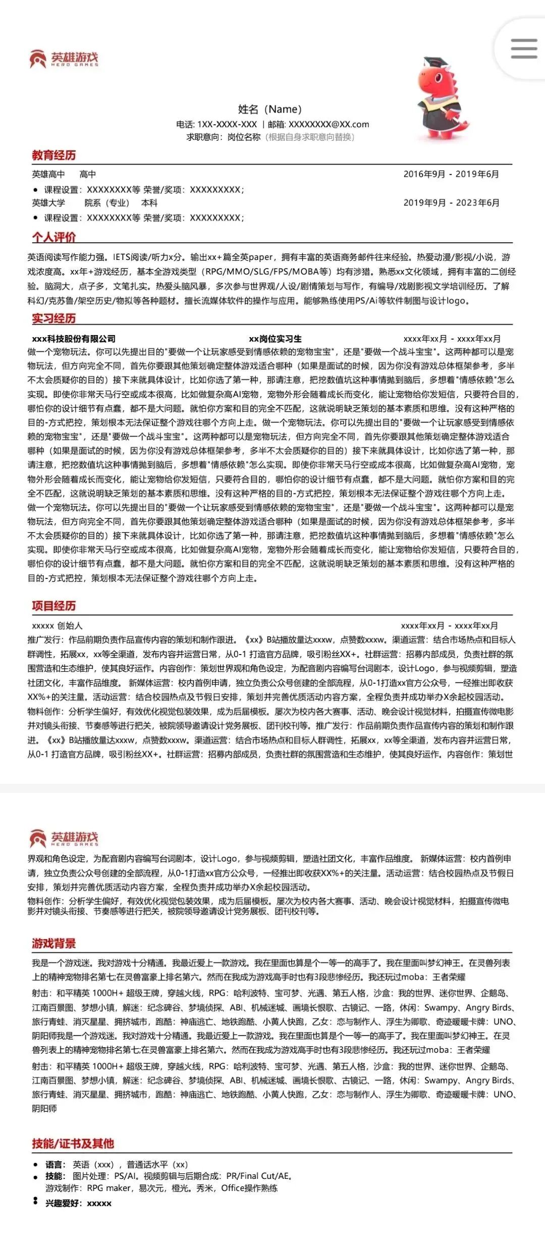 文末还有【英雄游戏专属简历模板】
