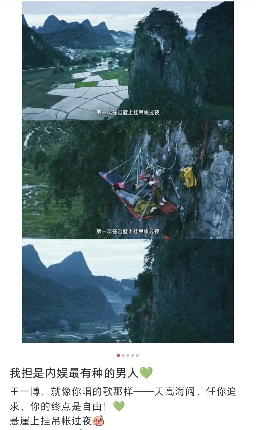 于是王一博和教练两人,头挨着头,脚挨着脚,仰面躺在岩帐上,就这么入睡了。