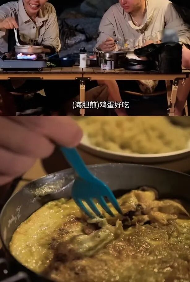而接下来等待他们的,是一场美味盛宴:海胆煎蛋、海鲜面、原生态烤肉......在海岛上露营的这一晚,Paupau教练真的把王一博养得很好。