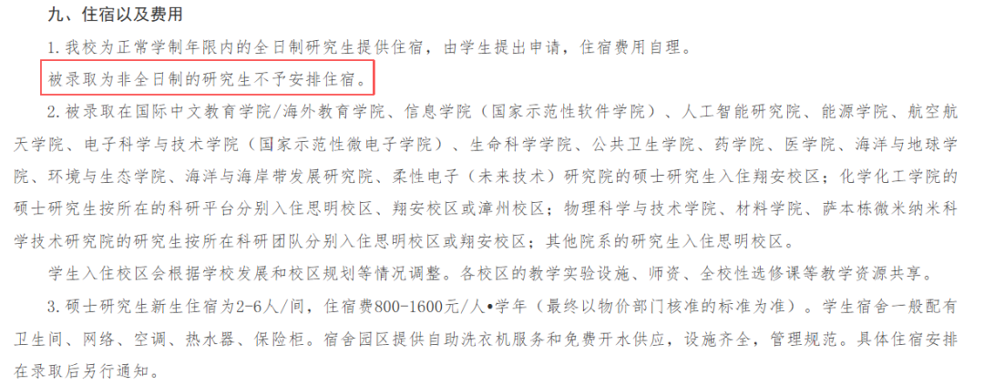 该校为全日制非定向学术学位硕士研究生在学制内提供住宿,全日制非定向专业学位硕士研究生提供第一年校内住宿;后续由各院系和实习实践单位协调解决。除专项计划外,全日制定向研究生不提供校内住宿。非全日制研究生不提供校内住宿。