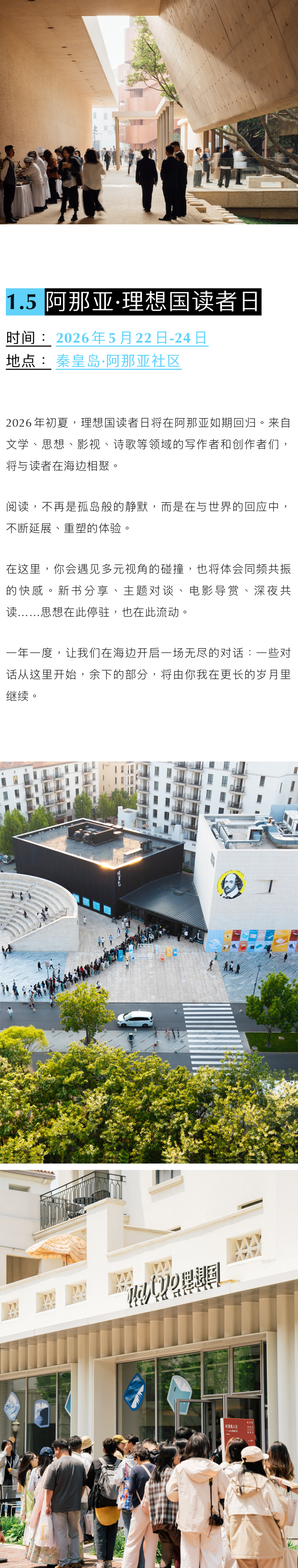 超100家具有公共人文价值的独立出版品牌将汇聚LESS新世相出版奖颁奖典礼,文化学者、知识分子,以及各行业领域的积极推动者们,将联合呈现主题论坛、影像放映、工作坊,以朋友之名,守护思考的火苗。世界规模最大、最具影响力的游艇展之一——法国拉罗谢尔大弦墙游艇展(Grand Pavois)再次登陆阿那亚!这场关于自由、潮流、冒险的滨海生活方式盛会,聚集全球顶级船艇品牌与海洋运动先锋,将在北岸掀起浪潮。海有边界,但想象力没有边界。从奢华游艇到潮流帆船,从专业航海设备到设计感海洋生活好物,邀请你体验海洋文化的魅力。亲身加入风帆试炼,乘着海风与热情交织出的独特vibe,驶向无拘无束的蔚蓝生活!当冬日的第一片雪花飘落海岸,阿那亚便摇身一变成童话的国度。千万点暖光蜿蜒成星河,漫天星光点亮璀璨梦境,童话集市里飘来热红酒的香气,在街巷邂逅梦幻奇遇……这是属于所有人的童真时刻。我们追逐着童话,给琐碎的日常添上仪式感。在童话邮局投递一份寄往远方的祝福,或是在小镇广场的钟声里,许下一个新年愿望,睁大眼睛注视飘舞的雪花,再一眨眼,你会发现,世界还是童年时的模样,一如从前。Trick or treat,一年一度的捣蛋时刻来袭!顺着时空裂缝,跳进兔子洞,奇遇世界别有洞天。得意的“显眼包”们,魔法巡游是你们盛大的舞台;讨糖小鬼带上提篮,挨家挨户撒欢;秘境精灵、奇妙生物,邀你共赴惊奇晚宴;篝火燃起,绚烂的铁花在夜空中绽放,如梦似幻。今年,这处容纳怪诞、拥抱疯狂的异想世界,会有哪些神秘客人不请自来,又会创造哪些魔法奇观?海边秋日,即刻揭晓!如果魔法节是狂欢的释放,那么魔法假期则是造梦的工坊。作为国内少有的全景式沉浸魔术体验盛会,阿那亚魔法假期将一次次颠覆你对魔术的认知。国际魔术大师将云集海边,在剧场、酒吧、街头带来风格迥异的魔术秀。你还可以走进魔法工坊,化身一日“魔法学徒”,或是钻进魔法市集,淘一件心仪的“法宝”。准备好开启想象力阀门,见证奇迹的时刻到了!地点: 秦皇岛·阿那亚社区/阿那亚·金山岭/中旅·阿那亚·九龙湖夏天,是孩子们率性生长的季节。从秦皇岛的海风、金山岭的山野,到九龙湖的绿意,自然探索、潮酷运动、艺术启迪、玩学成长四大主题的暑期夏令营,让孩子们融入同龄集体,在独立与合作中成长,收获一个闪闪发光的夏天。五月,当海风裹着槐香掠过礼堂尖顶,阿那亚的街巷便落满了雪。这是一年中最温柔的时刻,适合把日子放慢,把感官打开。每年的槐花季,都是一场以花为名的五感邀约。清晨在槐林深处遇见一场即兴演奏,午后在手作市集留住花瓣的轮廓,傍晚将刚采的槐花入馔,品尝初夏限定的清甜。我们用N种方式,打开同一场花事。槐香所指,就是家的方向。时间: 全年周六日、法定节假日(具体排期见阿那亚App)2025年,古典音乐在阿那亚落地生根,成为日常生活的背景音。北戴河的海边,我们用177天、341场演出定格浪漫乐章;金山岭的山谷间,44场音乐会藏着自然与韵律的共鸣;广州九龙湖畔,27场演绎点亮都市艺文日常。音符也曾飘落崇礼的雪场,在三亚的灯塔乐园大草坪上随风流淌……2026年,声声音乐艺术馆将在北戴河园区持续推出日出&清晨&月升音乐会系列、金山岭园区山谷回响系列等等声与景完美结合的音乐会,上百位优秀演奏家将为大家献上东西方器乐协奏的古典音乐会。三月中旬至清明假期,春日的旋律已排期就绪:从昆曲《游园惊梦》的黎明独白,到长笛与吉他的抒情对话;从东方雅集的弦语,到男中音与钢琴的海边回响……十余场演出,在日出时分与月升时刻交替上演。<上下滑动查看演出时间排期>