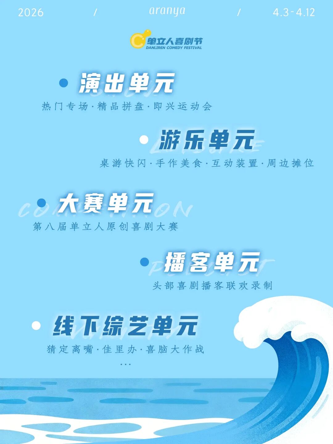 2026年阿那亚戏剧节,将继续邀请全球顶尖创作者、戏剧爱好者共赴海边,一同沉浸式探索关于生命、梦想与荒诞的表达。在这座幻梦之城,国际巨匠的先锋力作将在多元剧场空间里交织上演,艺术新声在“候鸟300”营地中野蛮生长,戏剧碎片随机掉落在海边市集、孤独图书馆、转角处的长椅,梦境与现实的缝隙迅速消弭。请准备好,跃入戏剧的火光中,拜访那个最原始、最纯粹的自己。当秋日的海风拂过银幕,电影便有了另一种呼吸。2026海浪电影周,将继续以电影为内核,跨界融合时尚、科技、音乐与艺术,打造由「场景」定义的全新电影社区生活方式。「海浪展映」,佳作连映,不舍昼夜;「海浪对话」,跨界共振,灵感共鸣;「海浪产业」聚合最前沿的产业力量;「海浪荣誉」见证新生代天才诞生……九月,一同奔赴光影之海。如果你需要一个理由把夏天彻底挥霍掉,那就是它了——海边的虾米音乐节!潮湿的风、掀翻天的音浪、爱了十年的乐队、一起看的橘子海日出,当千万颗心跳归于相同的频率,我们共同创造的感动,足以跨越时间。2026年,虾米音乐节将带着更炽热的诚意回归,邀请那些值得被反复聆听的声音,在沙滩上搭建起连接你我的声场。踩着夏天的尾巴,加入海边的集体狂欢,用最燥的方式,和夏天说再见吧!岁末,以思想交锋,为未来探路。作为美好生活的灵感策源地,2026阿那亚论坛将集结来自建筑设计、社区营造、文化艺术、商业创新等领域的先锋实践者,以跨界分享与嘉宾对谈,发起新一轮书写未来的共创。北岸雀跃镇,先锋青年的能量场,盛夏,阿那亚携手AVENUE & SON打造的世界级运动与青年文化盛会——GRAND MASTERS雀跃镇大师赛,已经成为国内潮流玩家们翘首以盼的重磅节日。2026,雀跃镇大师赛将再次升级。全新运动领域、更具观赏性的挑战、更多面向大众玩家开放的冒险。无论你是顶尖高手,还是捧场气氛组,都能在河海之滨的夏日热浪里,找到属于你的“雀跃时刻”!秋日海边,潮汐起伏,舞者们用身体与海浪对话,在自我、自然与世界的交界处,探寻灵魂的跃动。第三年的正在国际舞蹈节将如约到来,国际顶尖舞团与独立舞者将齐聚阿那亚,带来多元舞蹈现场。剧场内的沉浸式表演、海滩上的即兴创作、身体工作坊、影像展映与跨界对话……每一个起舞的瞬间,都是对生命的礼赞。这是一个大家因喜剧而聚在一起的节日,它属于每一位热爱喜剧的创作者和观众,属于所有愿意用笑意拥抱生活的朋友。如果幽默是化解生活琐碎的最好方式,这一回,我们也想把更多的快乐力量,塞进你手心!今年,喜剧OG、宝藏新人、《喜单》《脱友》《喜人奇妙夜》等综艺卡司汇聚一堂,除了演出单元和大赛单元外,还有游乐单元、线下沉浸式综艺、头部喜剧播客联欢录制轮番登场,陪你痛快笑一场。四月世界读书日,抖音商城携「文字漫游计划」落地阿那亚海边,邀你于文字间相逢。首届抖音商城文学大赏将同步启幕,多位知名作家、文化学者坐镇,联合出版社与媒体机构,共同见证年度最具公共价值的文字力量。