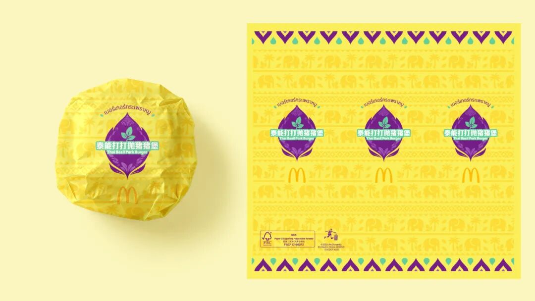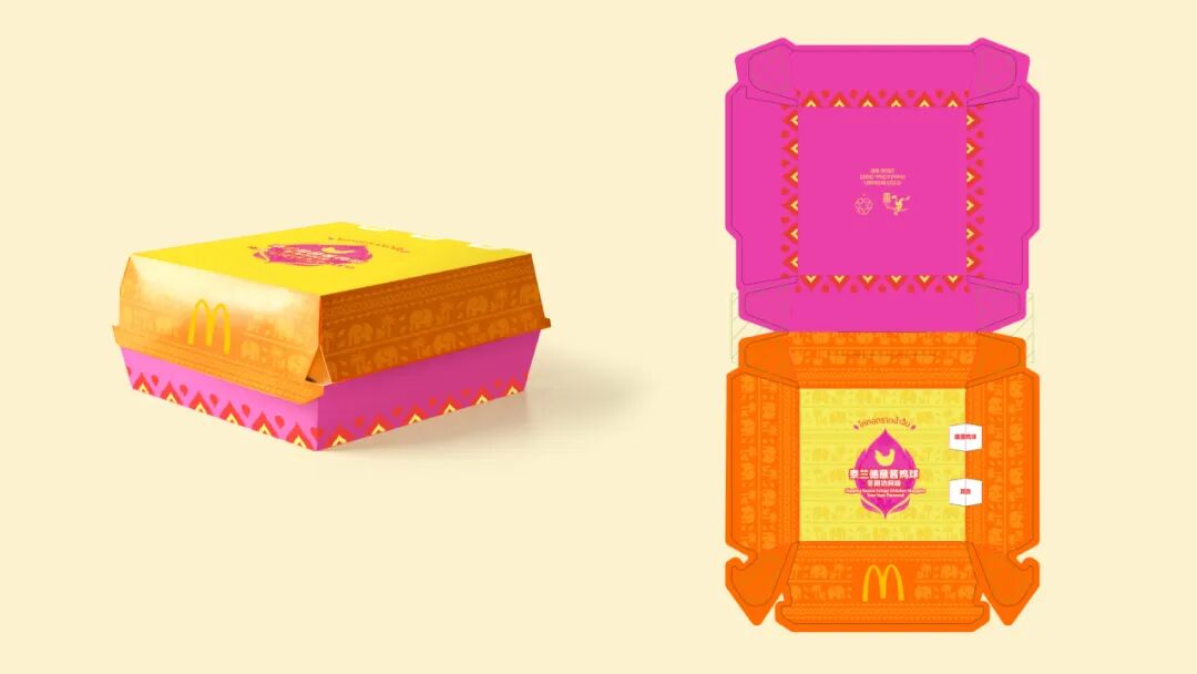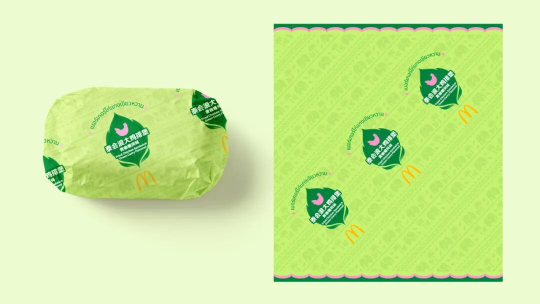 设计上没有铺天盖地的泰国元素,而是在保持麦当劳调性的基础上,提取了大象、椰树等经典符号,用黄、橙、绿等高饱和撞色,把“泰式”这件事做到“一眼识别”。