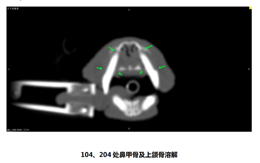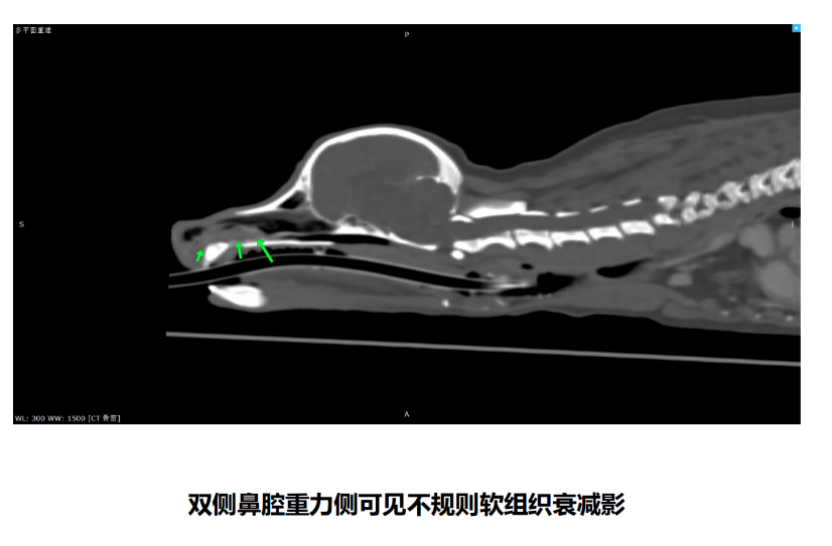 首先考虑呼吸道病原微生物感染导致,做犬呼吸道核酸排查,显示支原体阳性,遂先按照犬支原体感染治疗,多西环素搭配雾化药每日使用,家长反应稍有好转,但是感觉反反复复,不能够好的彻底,反复一个月后建议家长进一步安排高阶影像学检查鼻腔情况以及药敏试验。