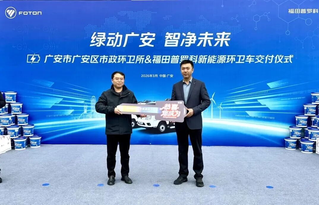 3月18日上午,以“绿动广安 智净未来”为主题的广安市广安区市政环卫所&福田普罗科新能源环卫车交付仪式在广安隆重举行。此次交付既是福田普罗科助力地方环卫装备绿色升级的重要行动,更是政企携手推动城市环境治理向低碳化、智能化迈进的关键一步。