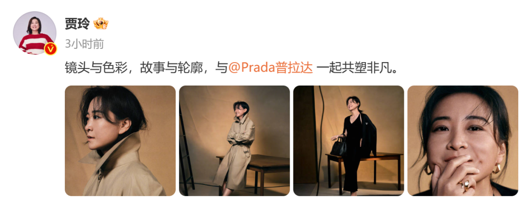同时,@贾玲 发文表示,镜头与色彩,故事与轮廓,与@Prada普拉达 一起共塑非凡。
