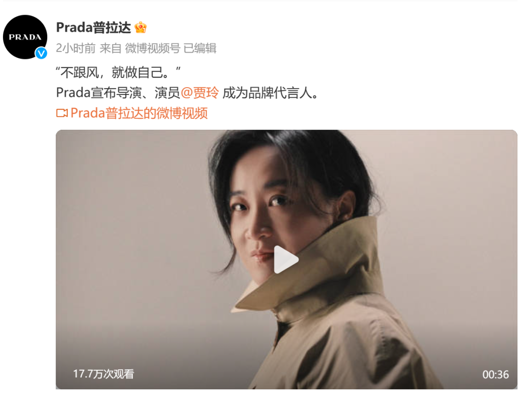 6月2日,国际奢侈品牌Prada官宣导演、演员贾玲正式成为品牌代言人。宣传视频中,贾玲踩着高跟鞋拍摄,“不跟风,就做自己。”