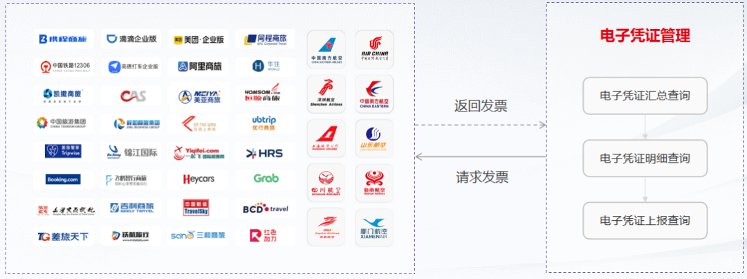 目前,用友YonSuite商旅费控已经实现数电票(铁路电子客票)、数电票(航空运输电子客票行程单)、数电票(增值税普通/专用发票)等直联取票,实现了商旅预订从出票到报销流程的全面自动化,无需采集、无需经手,无需报销,打通了业财税资档等各环节全流程,满足企业费控-商旅-对私报销-对公结算-入账-核算-上报-归档全流程无纸化需求,同时以专业服务和丰富经验保障企业的电子凭证落地使用。