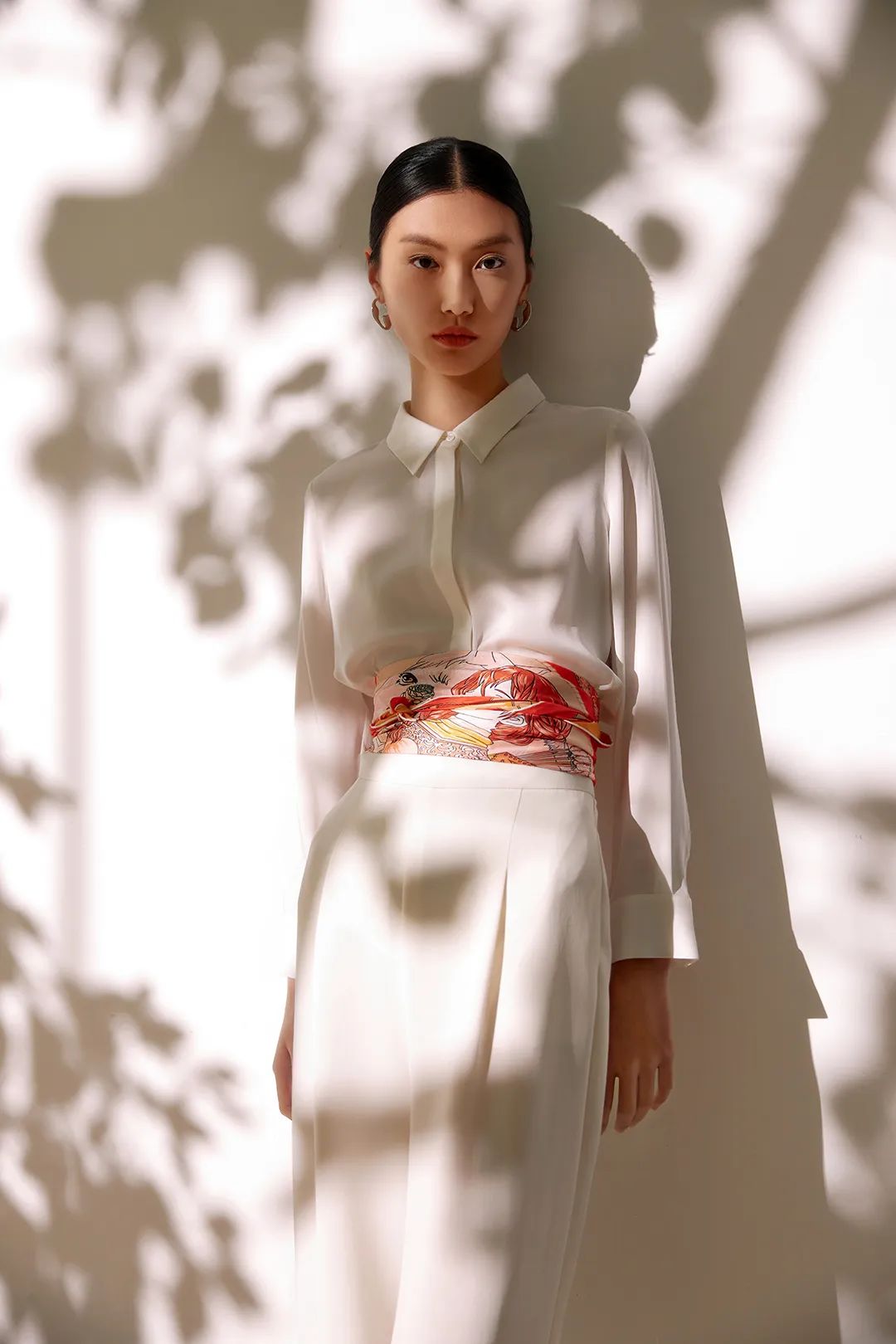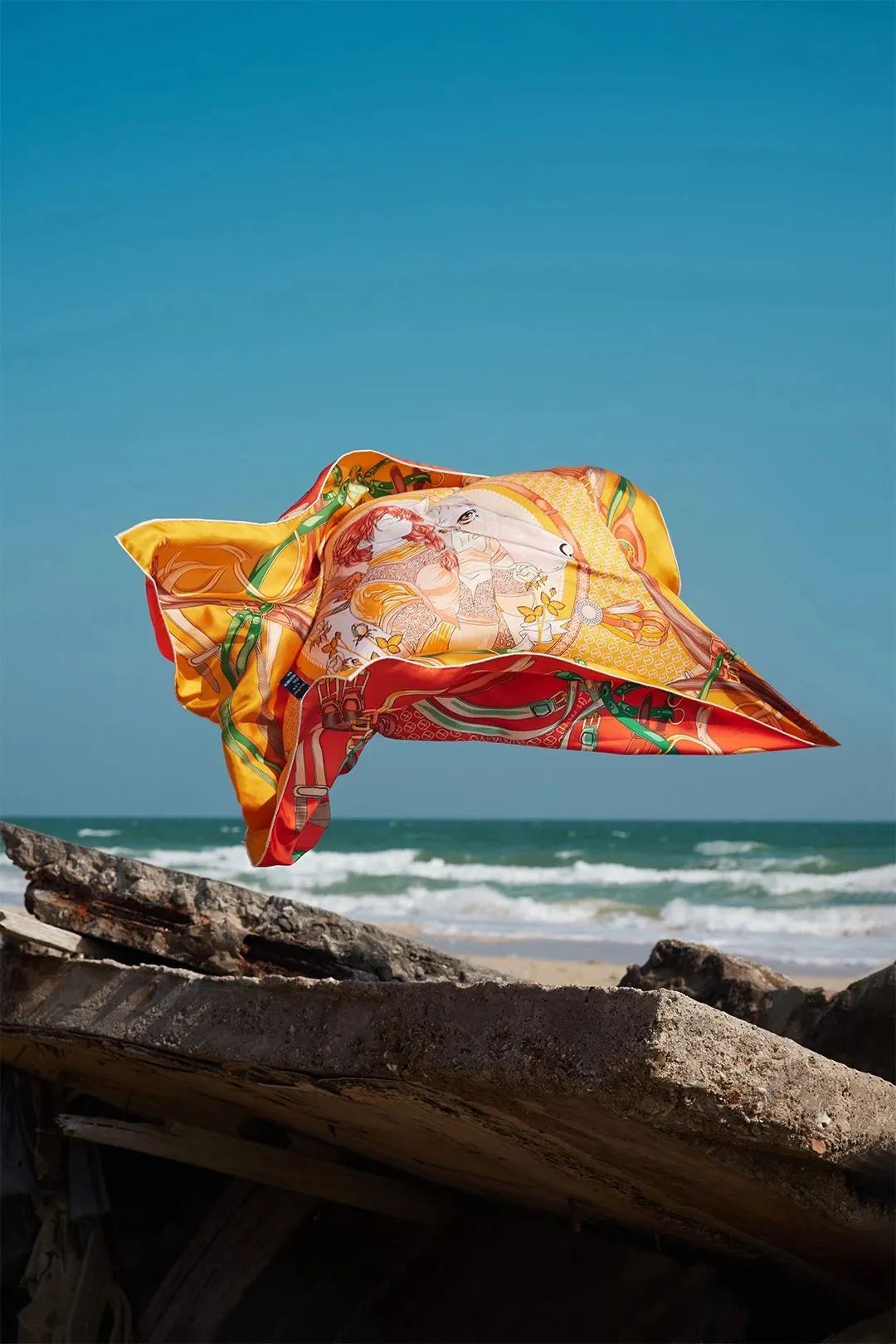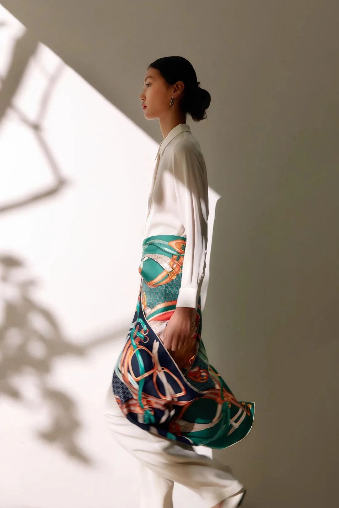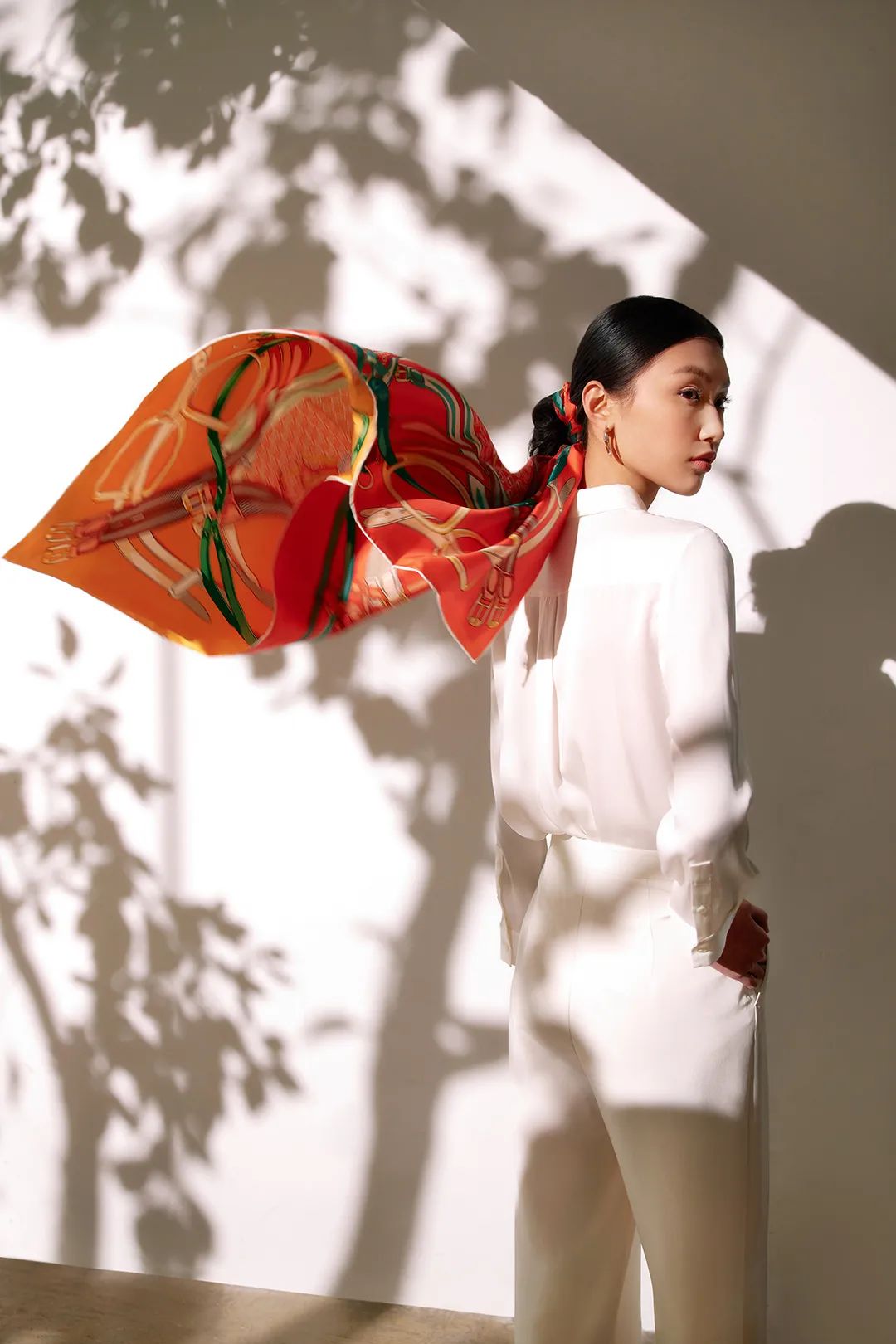图案展现出卓越的色彩饱和度与精细的色域呈现,其设计独特之处在于丝巾的双面,虽同为花纹图案,却巧妙呈现出迥异的色彩风貌。当穿戴简约素雅的服饰时,巧妙地系上这样一条丝巾,即刻成为整体装扮中的点睛之笔,显著提升整体造型的活力与亮点。