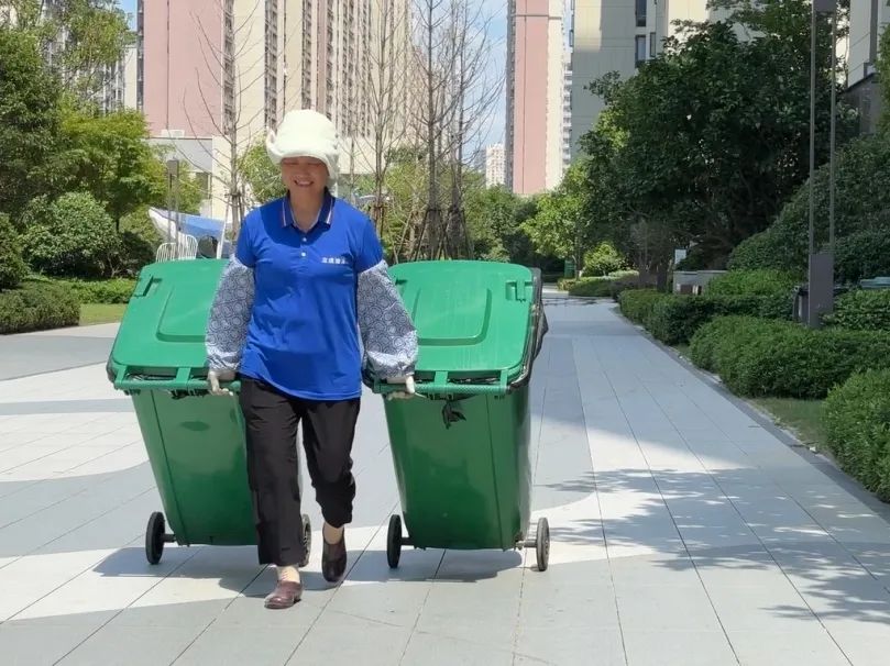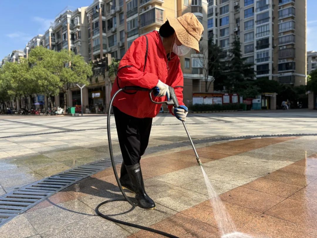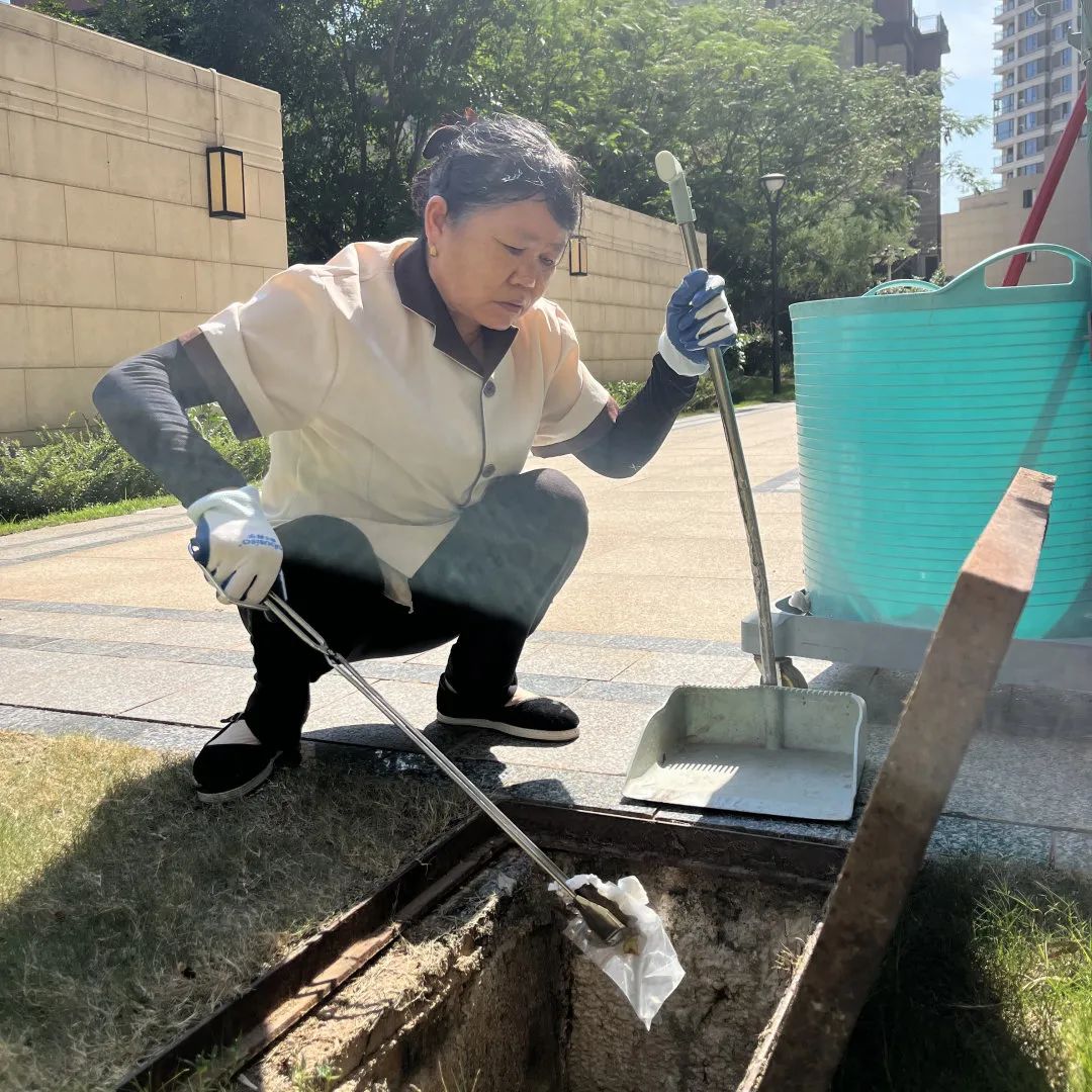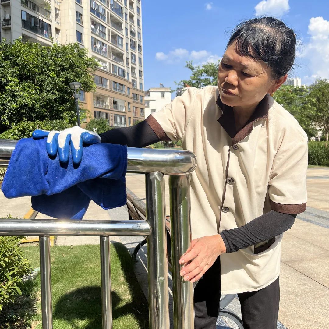 当许多人还在睡梦中时,保洁人员已经上岗了:清扫路面、清理生活垃圾、清洁楼内公共区域、擦拭游乐健身设施、清洗垃圾桶……他们如同一双有形的大手,为晨起的园区“洗脸”。