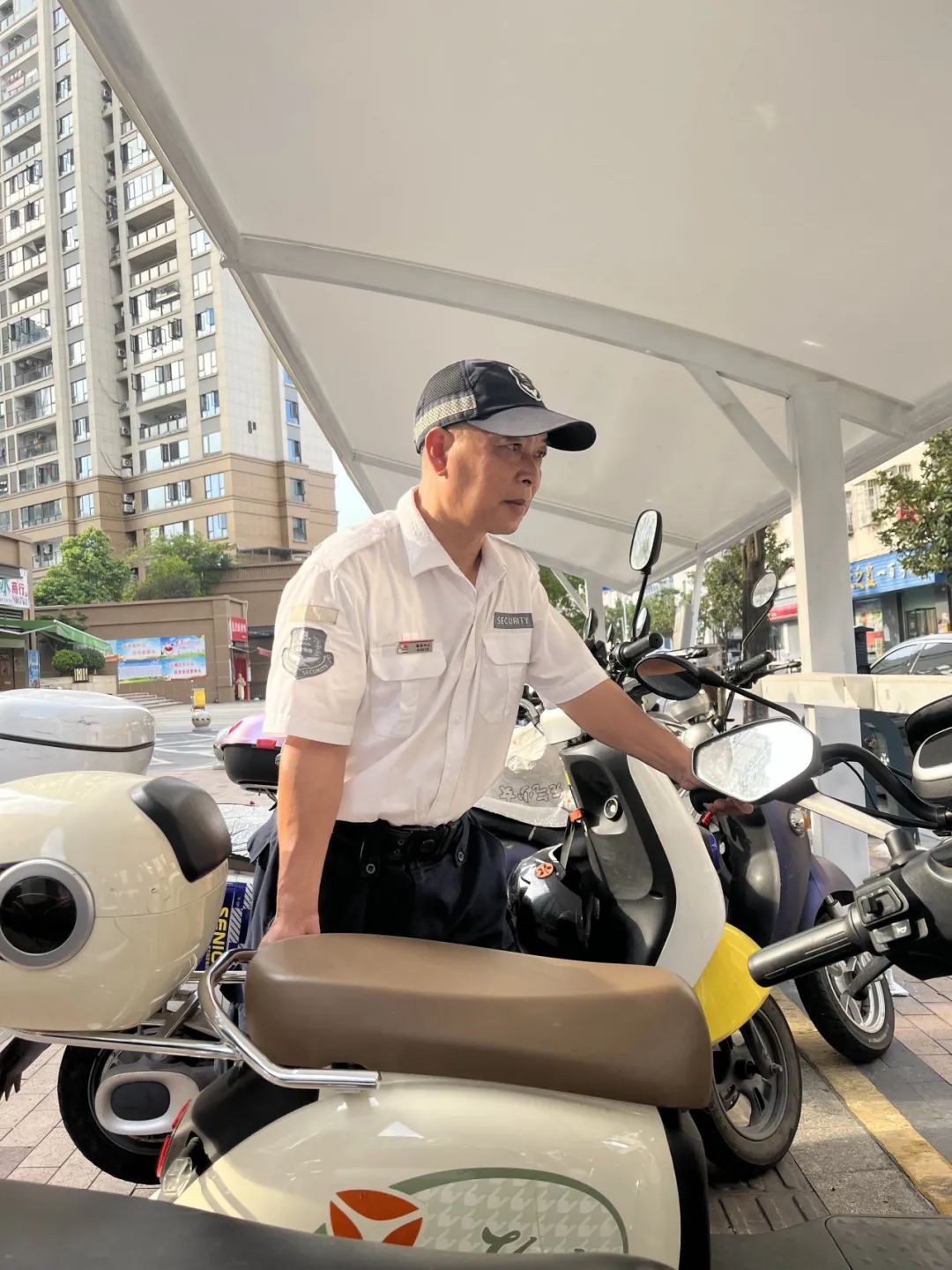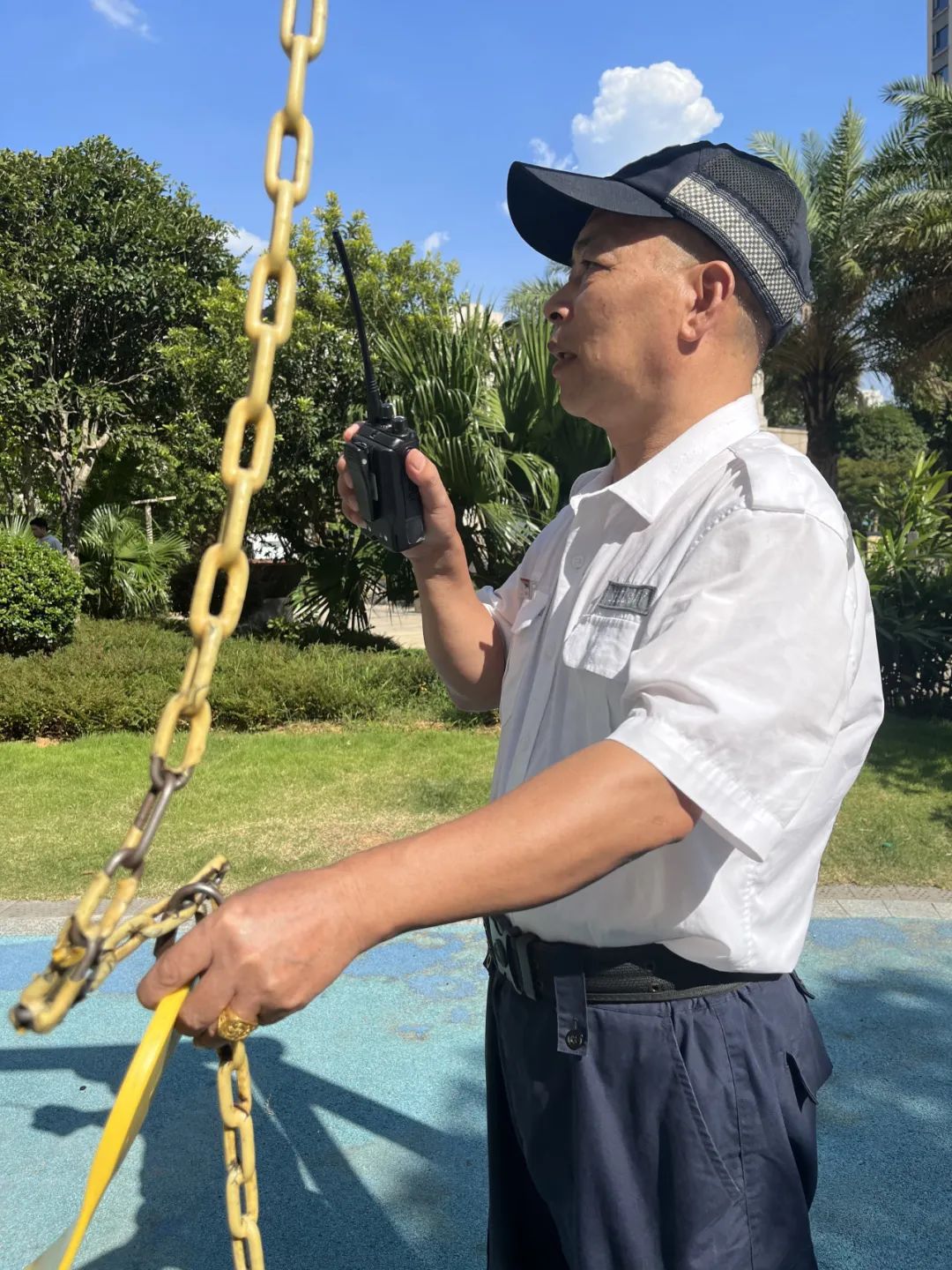 他们身姿挺拔,无惧骄阳,是园区安全的防卫线。因为长期在烈日下暴晒,他们的额头上、脖颈下、胳膊上都留下了“泾渭分明”的界线,那是他们烈日坚守的印记。