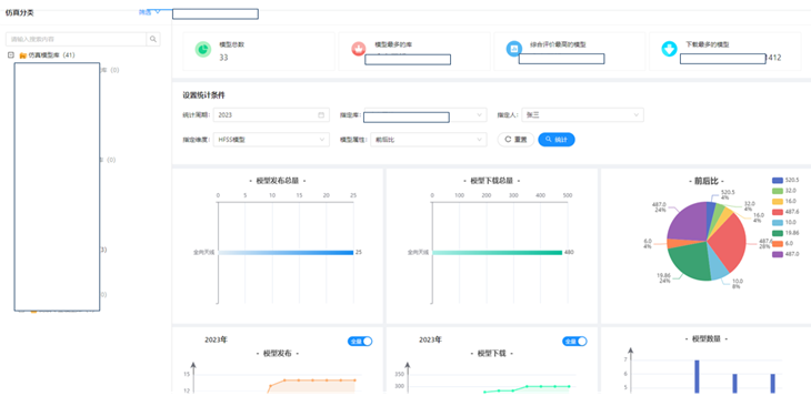 系统提供模型发布、模型下载、模型评分、模型属性等数据的统计图,支持管理人员对模型价值进行分析。