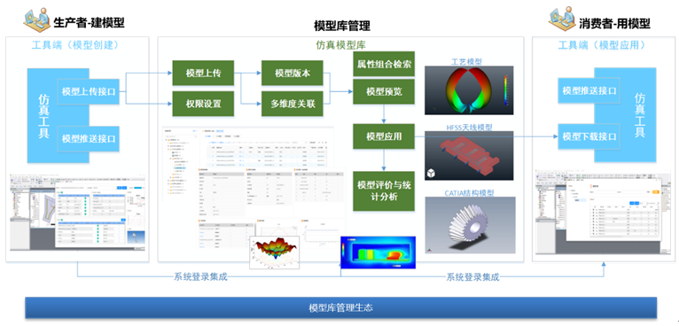 PERA SIM MLib 针对多学科多专业的仿真模型数据进行结构化管理、支持对仿真工具进行插件式开发,可直接使用工具软件快速上传、下载模型,实现多专业多学科的模型及仿真工具的规范化管理。MLib可统一管理仿真过程中使用的各类商用工具软件设计的多类型仿真模型,并将不同类型的模型进行关联,提高仿真资源利用率,提升仿真计算水平,节约人力资源、软件资源、计算机资源等,提高仿真效率和仿真水平。通过MLib我们可以搭建一个完善的模型库管理生态,在这个生态中有建模工程师作为生产者,通过MLib与工具间的接口上传模型。模型上传后,通过MLib能够对这些模型进行管理,最后用模人员作为消费者通过我们的下载接口下载模型进行使用。