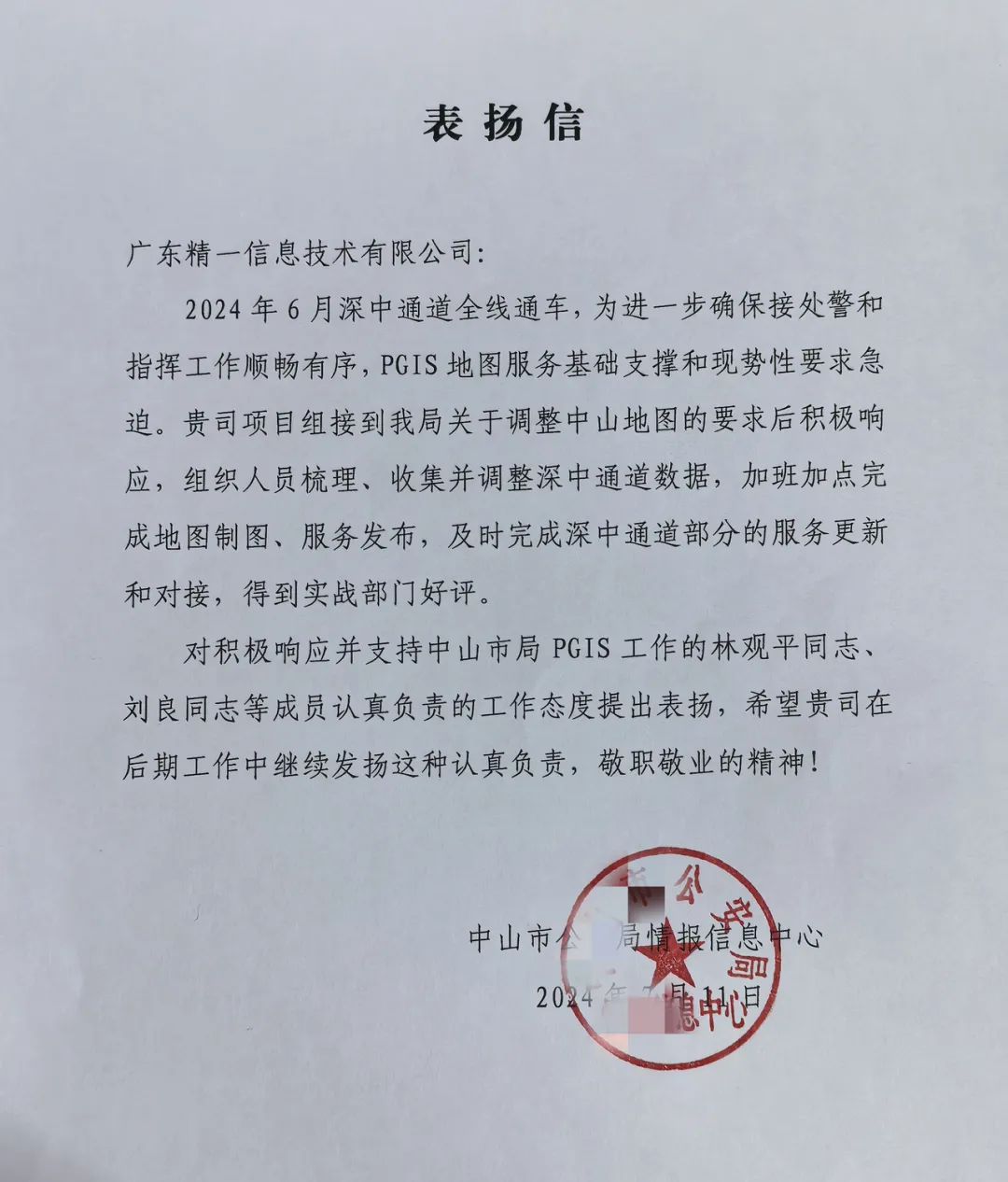 近期,广东精一信息技术有限公司(简称“精一信息”)收到一份特殊的礼物——一封来自中山市公安局情报信息中心的表扬信。在这封沉甸甸的表扬信中笔墨真诚、字字用心。它是一种无声的交流,是对我们工作强有力的肯定,也是对团队在2024年6月深中通道全线通车期间辛勤努力与卓越贡献的高度认可。