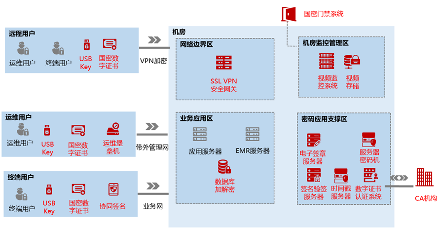 按商用密码应用方案,基于等级保护网络分区基础之上,机房网络以商用密码应用分为四个区域。如下图所示:
