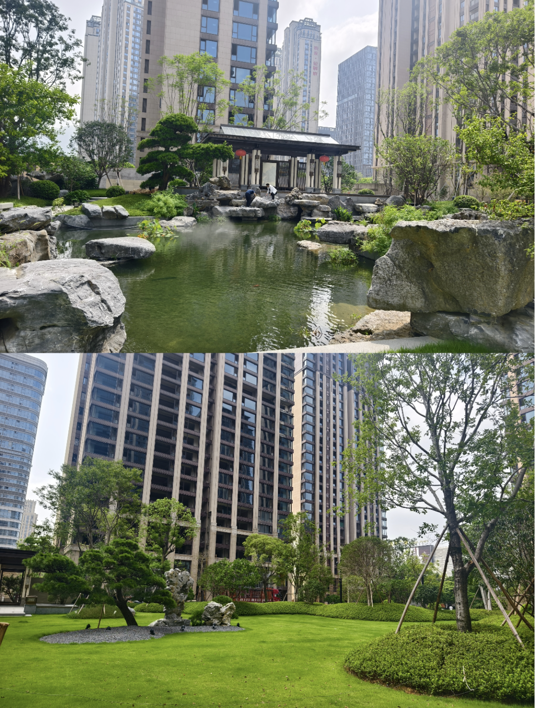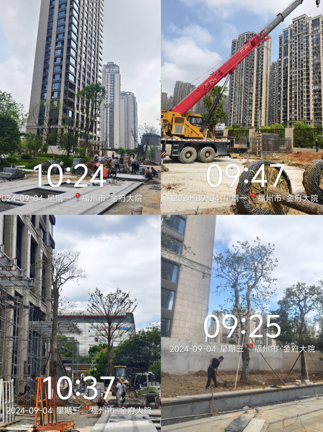近期小编来多次探访现场,每次来访景观都有不一样的感受,无论是从南门门头的封闭提升改造施工,还是园林全冠苗木的移植,景观工程正在逐步呈现。其中,近一个月来新种植近百棵高大乔木,如丛生香樟、小叶榄仁、红果冬青、弯杆朴树等名贵树种,无不体现泰禾造园的匠心。今日,园林施工团队46人正全力完善铺贴工程、南门门头升级、北门铜饰完善等。目前整体景观施工进度已达80%,九州胜景即将呈现。
