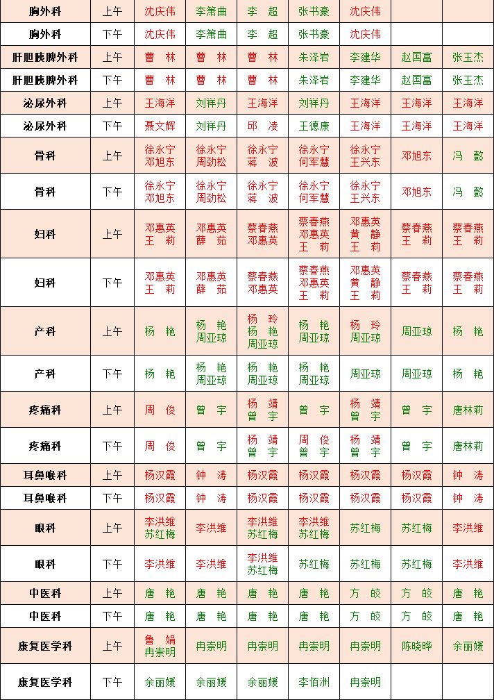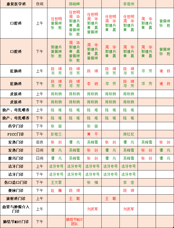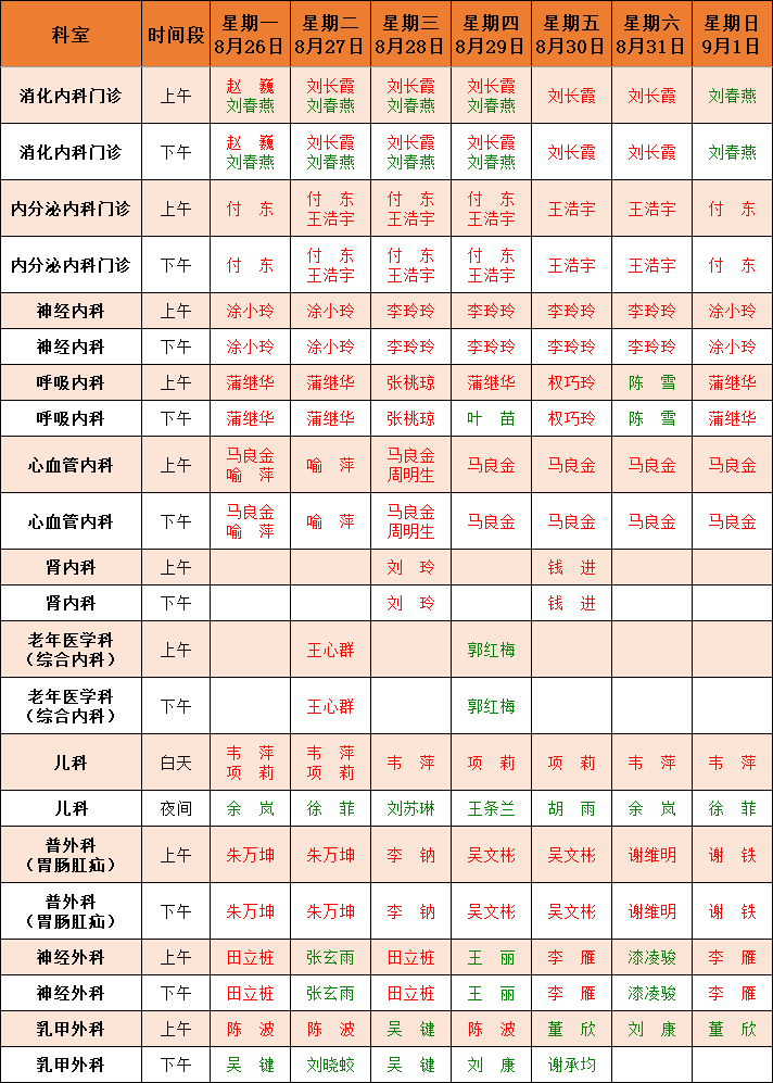 门诊一周坐诊公告(8月26日-9月1日)