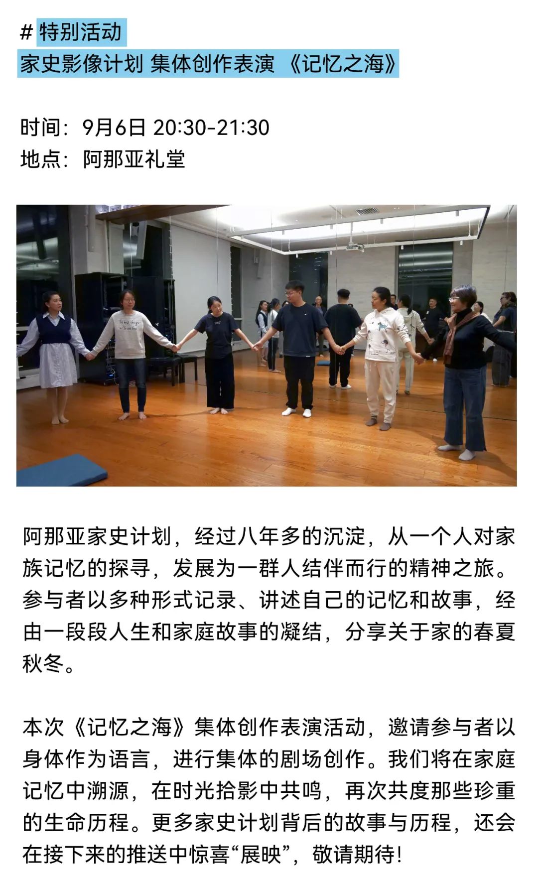 家史,是对生命历程的溯源,也是对当下坐标的审视。阿那亚家史计划已经进行到第八个年头,我们在这个过程中理解彼此、重塑自身,也准备将家史影像计划的成果搬上舞台,以身体作为语言加入肢体创作,集体创作一台剧场作品,向更多人讲述与传递关于家的情感与故事。