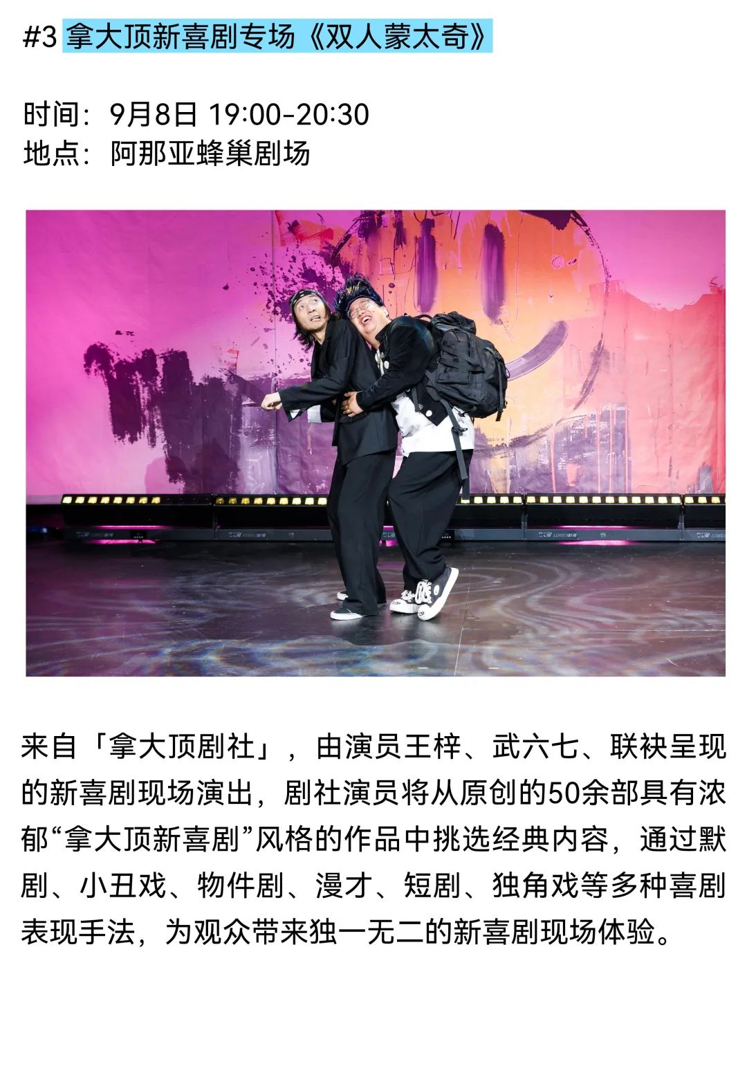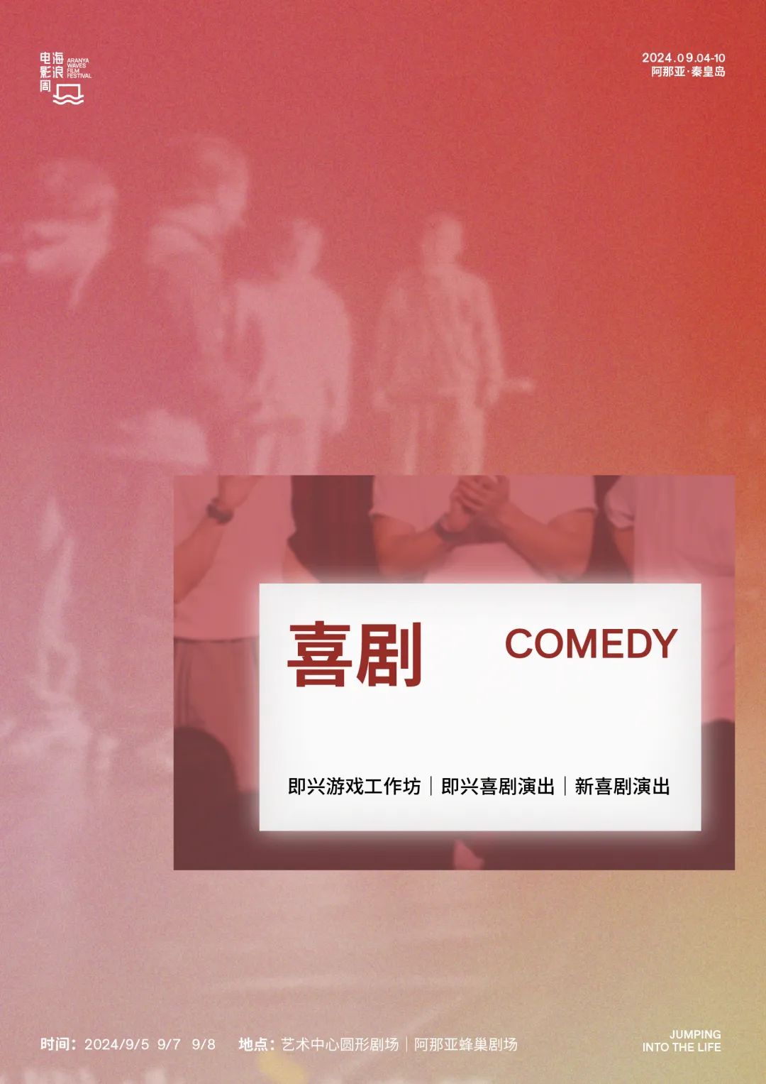 安德烈·巴赞说,“电影是现实的渐进线”。电影作为一门来自生活的艺术,最终将走向真实的生活,用艺术的灵晕去充盈日常,引领我们将视线聚焦在生活细微之处的美好。海浪电影周期间的阿那亚,点亮海边小镇的不只有光影,还有自由浪漫的“附近的生活”。今年海浪电影周的「海浪生活」部分,喜剧、舞蹈、肢体表演、乐队演出等各种艺术形式,以及浪漫的海浪市集,将融入阿那亚社区的日常场景与真切生活之中,成为年轻灵魂们的灵感发生所与心灵栖息地。年轻的朋友们,快来海边相会!一起放肆大笑,一起随性起舞,一起逛市集,一起听喜欢的乐队,一起用肢体表演分享自我的生命历程……我们从四面八方出发,再汇入生活这条水乳相融的河流,携手同行一段明亮治愈的灵感之旅。笑,是人类本能的表达方式,更是生活的“刚需”。一场喜剧,带来肆无忌惮的大笑,也帮人们找到情绪的出口。海浪电影周期间,火锅即兴、拿大顶剧社将呈现3场喜剧演出及工作坊,带领朋友们一同欢笑,直面生活的荒诞与浪漫。