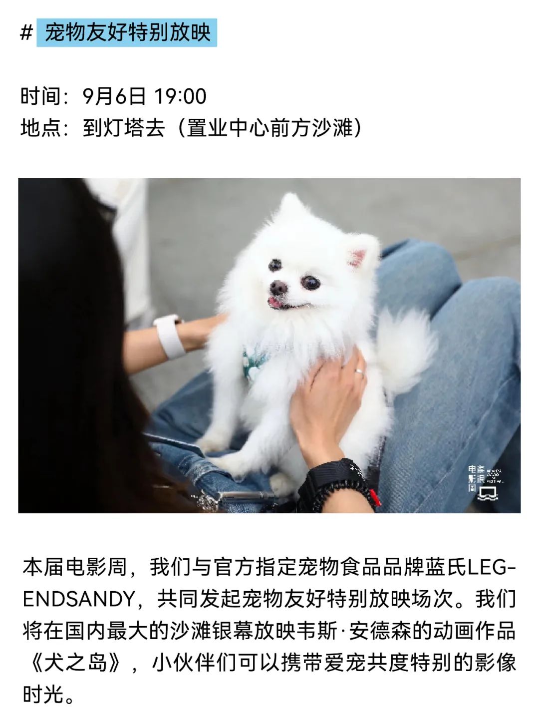 海浪电影周联动官方指定宠物食品品牌蓝氏LEGENDSANDY带来宠物友好专场放映,希望你和你的毛孩子在海边看得尽兴,玩得开心!