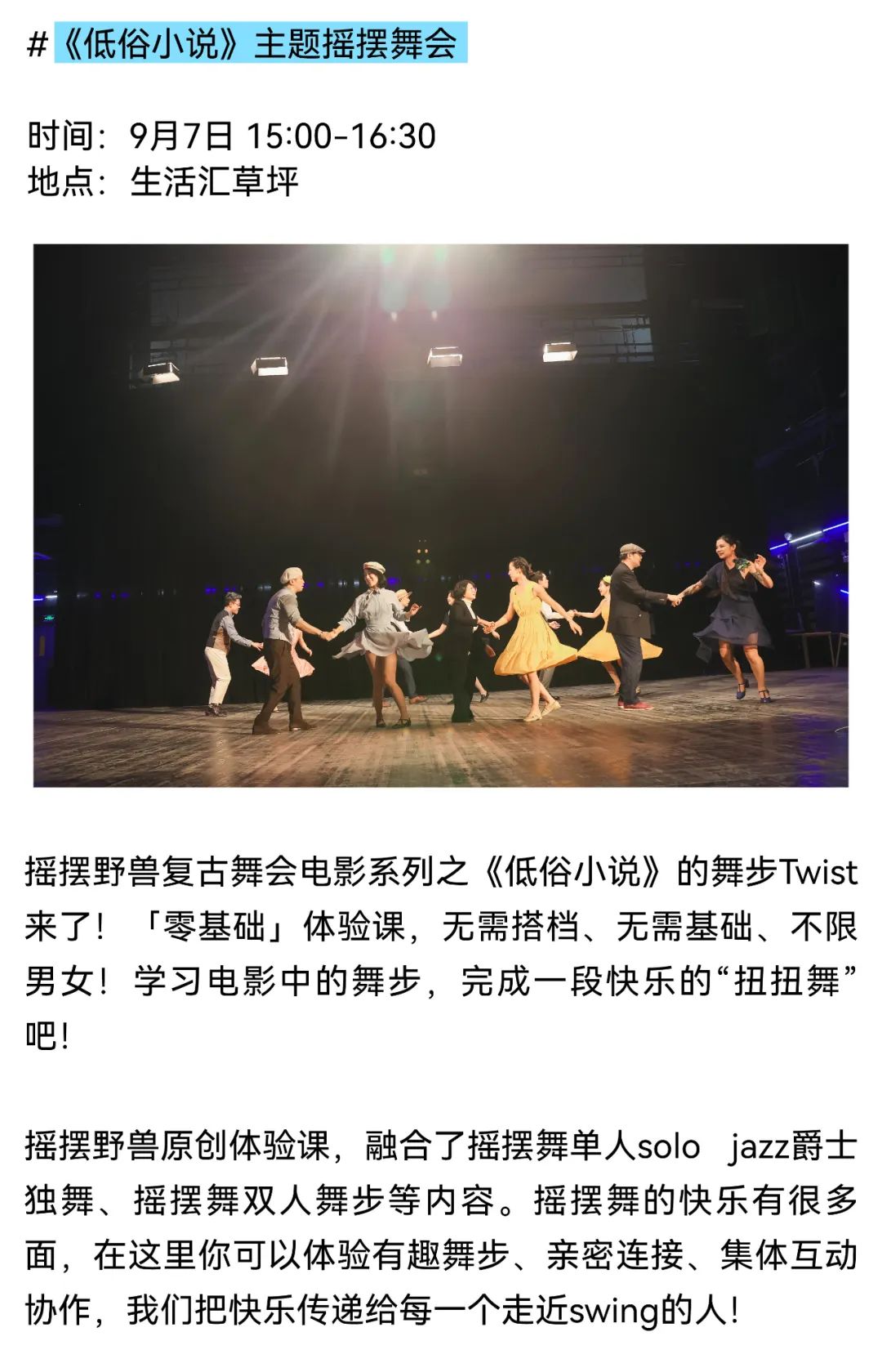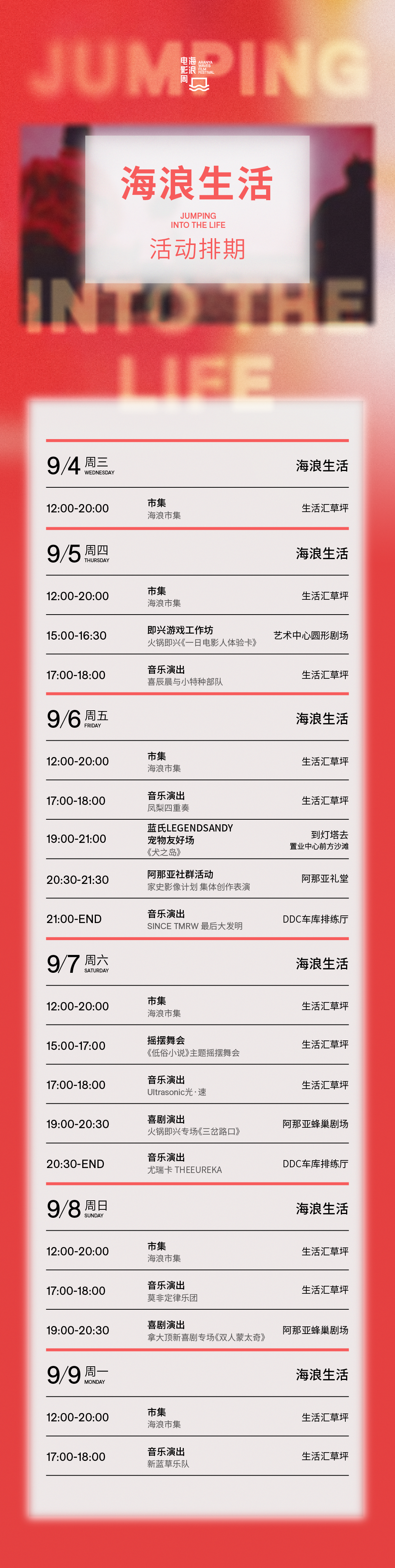 “生活本身就是一场即兴的舞蹈,每个人都是舞者。”Just dance!让生活的烦恼随着舞动散去。在海浪电影周期间,我们将为观众带来摇摆舞快闪及摇摆舞会,简单而有规律的舞蹈,冲刷疲惫的精神世界,带领我们“舞”向心灵的自由。