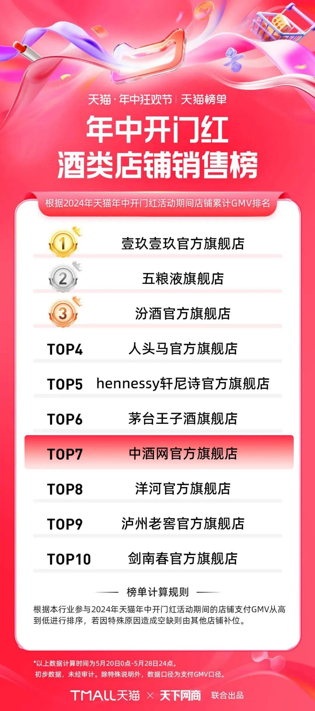 2024年电商年中狂欢节已经拉开帷幕,中酒网凭借其卓越的品质和优质的服务,荣获天猫销量TOP7的佳绩。这一成绩不仅是对我们品牌的认可,更是消费者对我们多年坚持质量与服务的肯定。