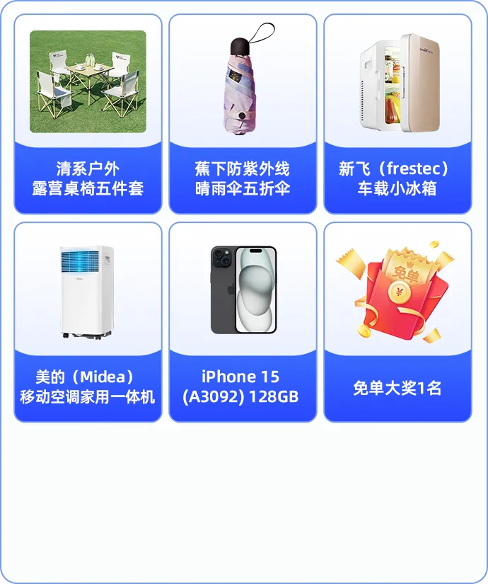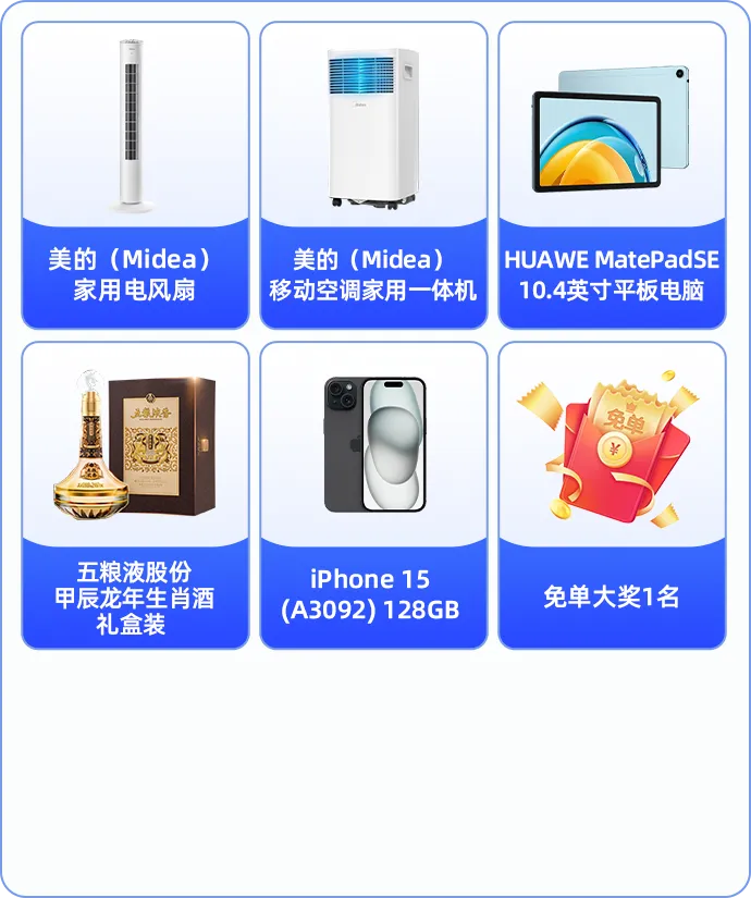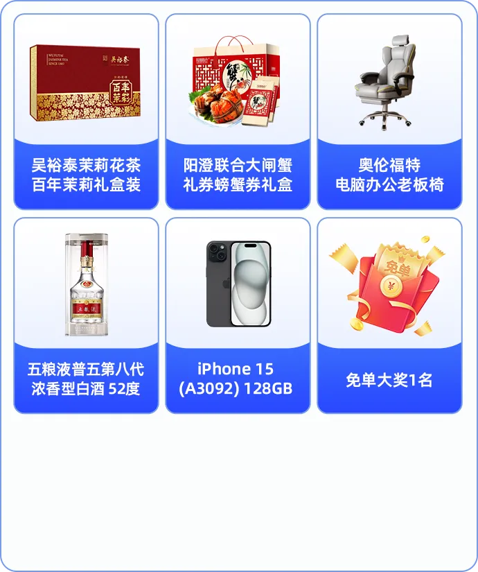 直播奖品:免单大奖1名、iPhone15、五粮液、办公老板椅、阳澄联合大闸蟹礼盒、吴裕泰茉莉花茶礼盒。