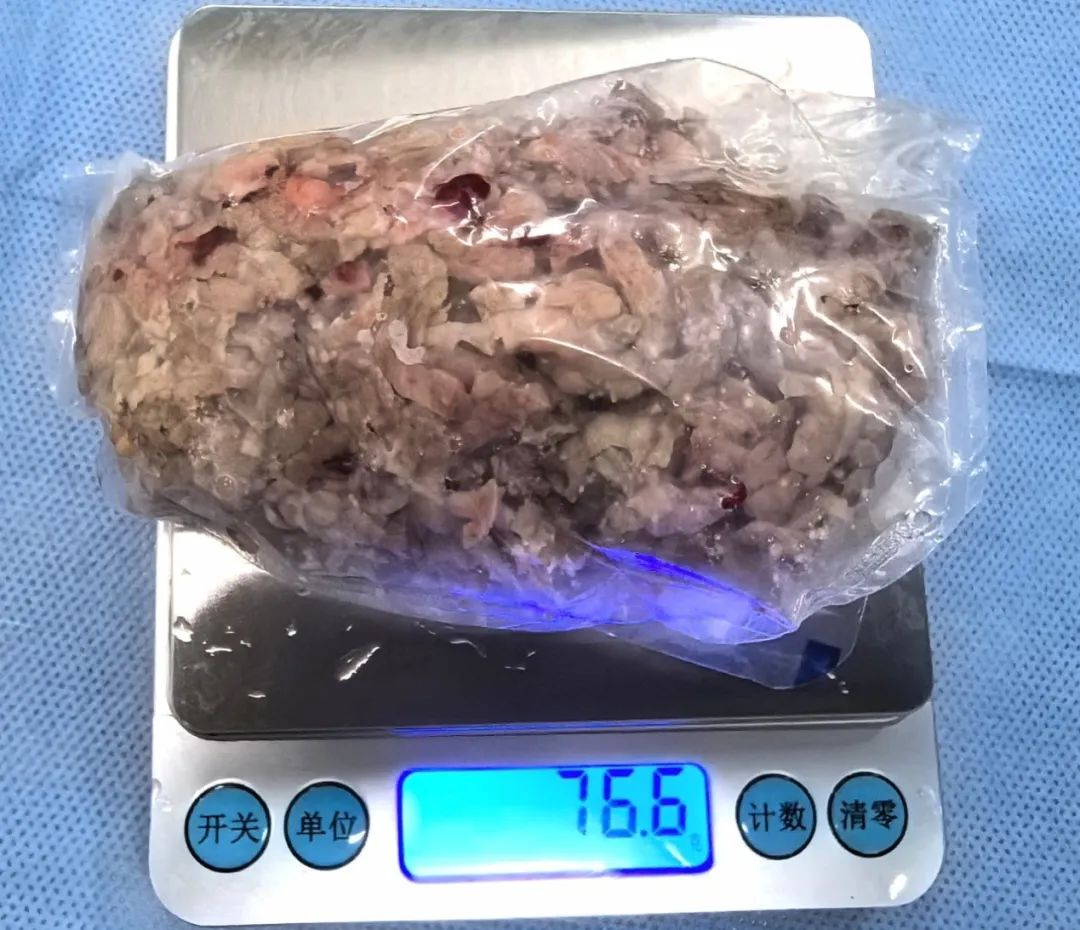 手术由邱凌副主任医师主刀,董永超副院长指导。因汤大爷前列腺大,再加上电切前列腺是“慢工细活”,整个手术用时2小时40分钟,切下增生腺体76.6克,加上被“汽化”部分,总重量超100克。患者术后没有出现任何手术并发症,术后在护理人员的精心护理下,恢复良好,顺利出院。