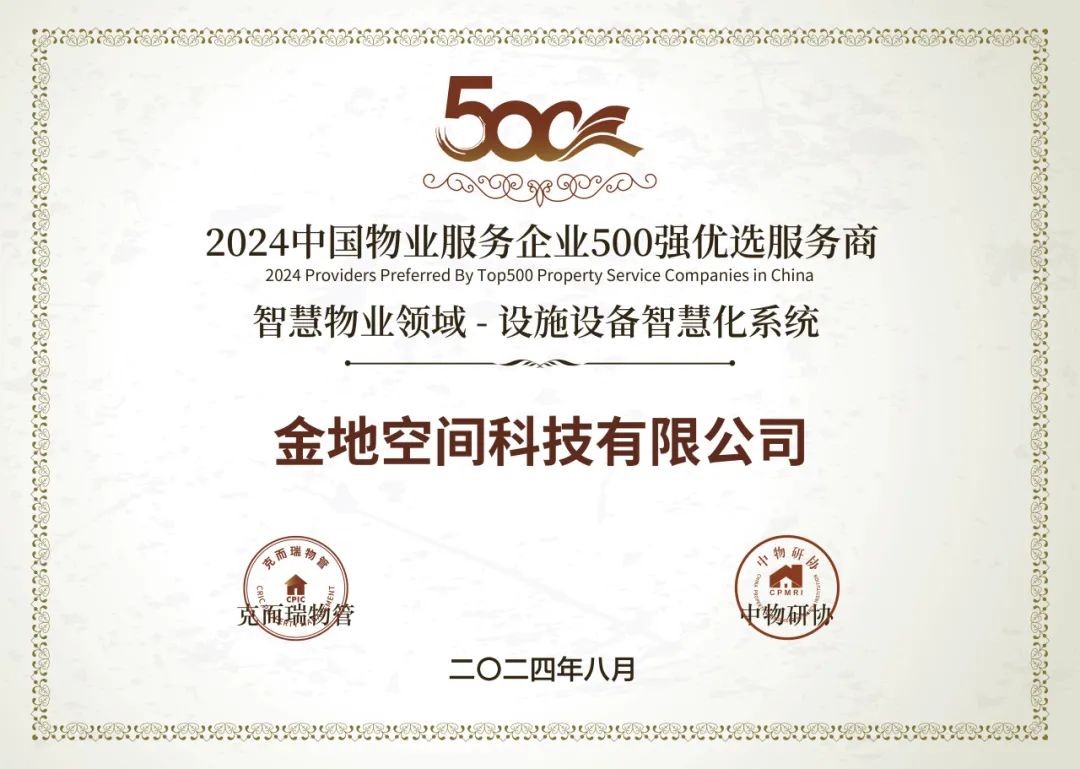 喜报 | 金地空间科技、安承电梯荣获2024中国物业服务企业500强优选服务商
