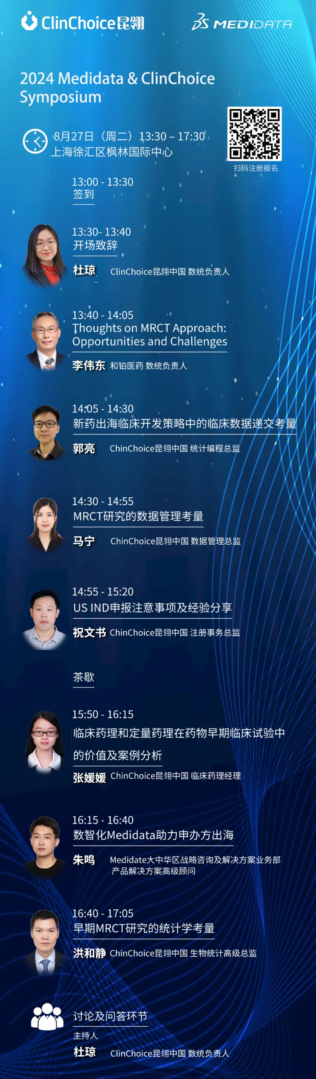 随着药物全球研发的持续推进,中国医药企业国际化步伐的加快,国际多中心研究临床试验(MRCT)也备受关注,那么在进行MRCT研究时,设计及统计分析的考量有哪些?新药出海临床数据递交策略应如何考量?临床药理和定量药理在早期临床实验中有哪些价值?美国 IND申报又需重点关注哪些方面?2024年8月27日(周二),ClinChoice昆翎将再度携手Medidata, 邀约各位共同聚焦MRCT。如需参会,请扫描下方二维码进行注册。本次会议为审核制,会议详情将在审核通过后,会议前一周内以邮件形式发送。期待您的莅临。