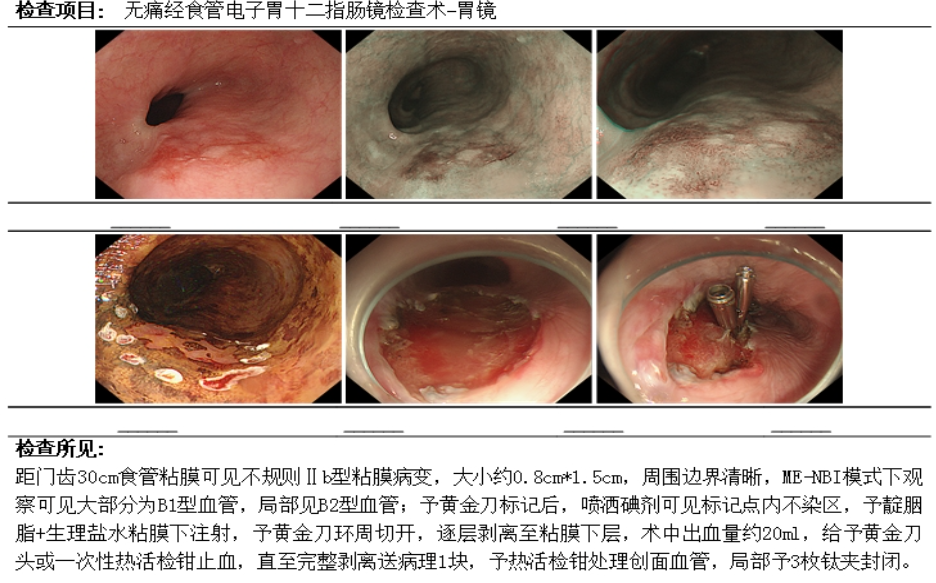 经过一系列充分准备,由我院消化内分泌内科副主任、主任医师赵巍主刀,为罗先生实施了ESD微创手术:麻醉成功后,通过内镜在病灶周围标记→黏膜下注射→环周切开黏膜→黏膜下剥离→创面处理。手术过程非常顺利,术中出血量不足5毫升,病灶完整切除,保留了食管肌层及外膜,避免了切除食管,再用结肠替代食管的复杂手术。罗先生从麻醉中醒来,感觉只是安心地睡了一觉,丝毫没有感受到手术的疼痛。