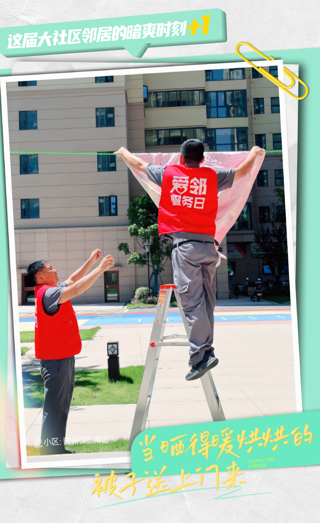 拥抱阳光的方式有很多种,但在大社区,小管家们选择将阳光装进大家的被子里。这项坚持多年的服务,让邻居们不必非得和艳阳打个照面,在家中安享清凉也能拥有一床晒得暖烘烘的被子。