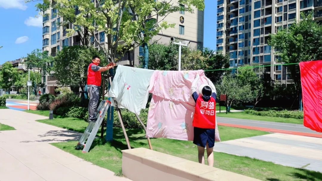 8月,大社区迎来了一年一度的“晒被子大赛”。小区运动场、天台、中庭等空旷地带都成为晒被的主场。物管处全员争分夺秒地就地架起晾晒杆、拉上晾晒绳,带来一片片被子海洋。