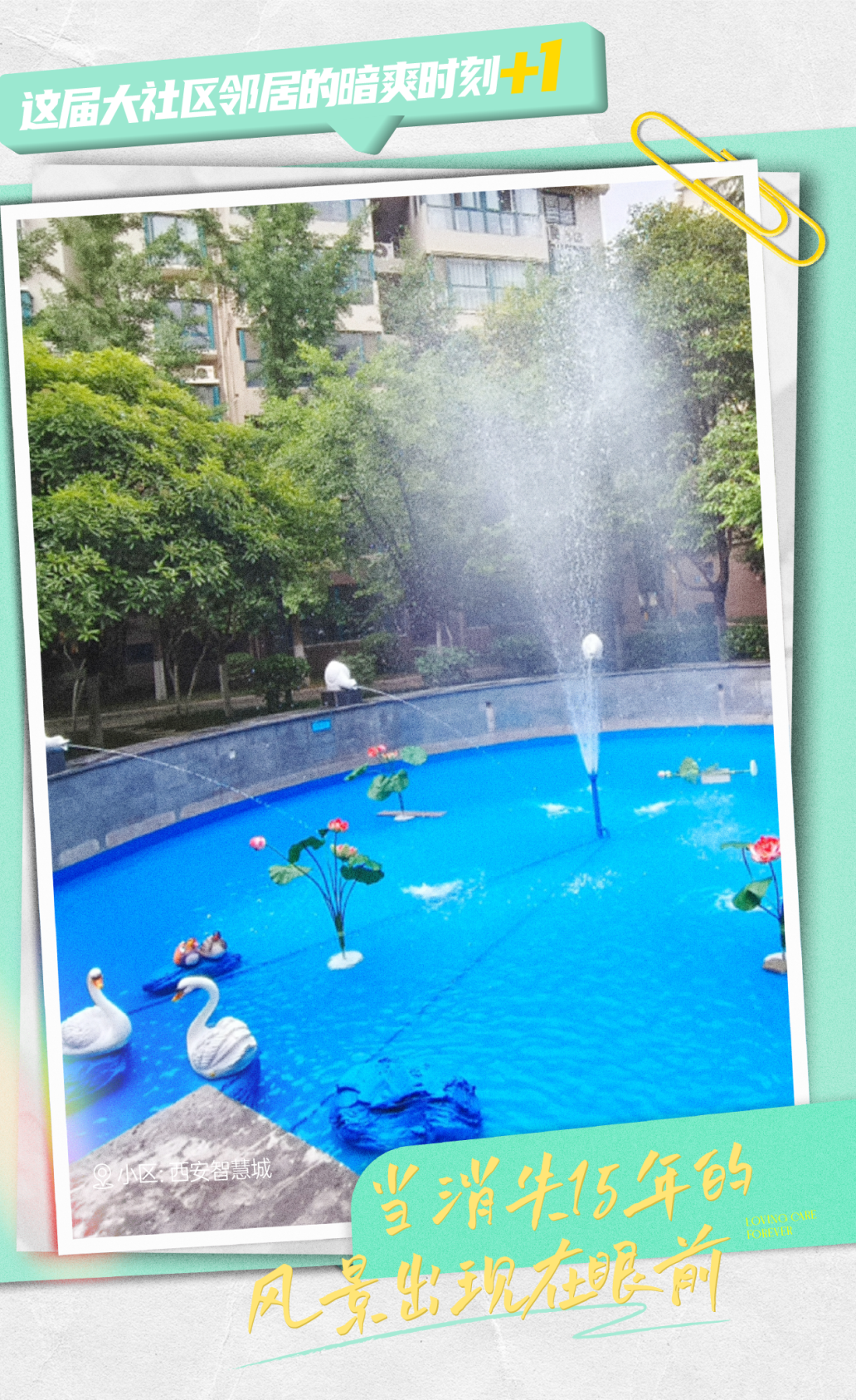 生活不止远方的旷野,还有眼前这汪清澈见底的池水,为燥热难耐的夏日带来身心愉悦的清凉感受。8月,西安智慧城小区西门广场处的天鹅池与水车池经历了大半年时间的改造、调试和完善,在期待的目光中,终于投入使用。