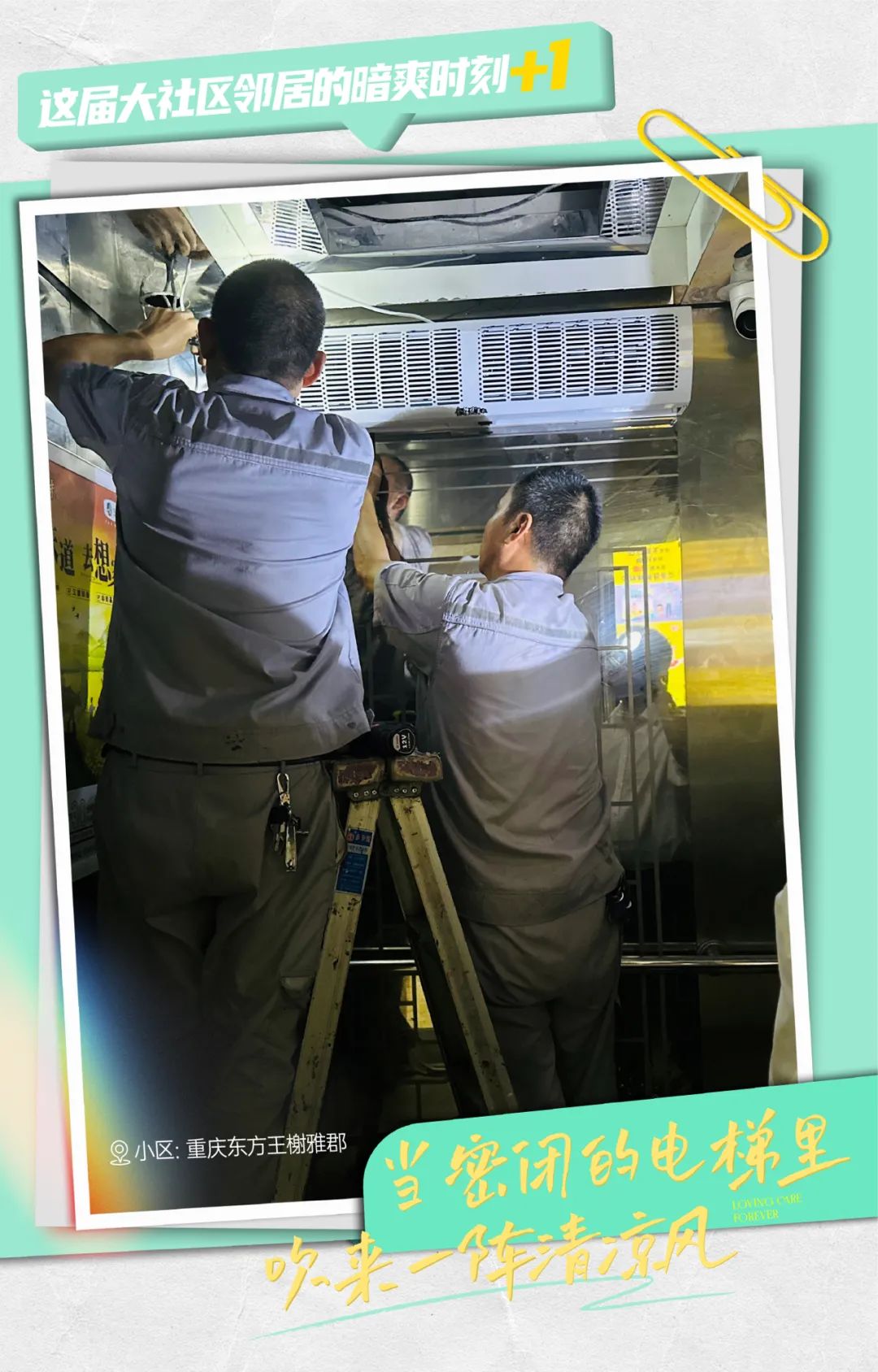 8月,重庆东方王榭雅郡启动了“电梯清凉升级”专项服务。小区物管处征询广大邻居的意见之后,为园区多部电梯统一安装了风幕机,至此,“回家的路上凉快多了!”