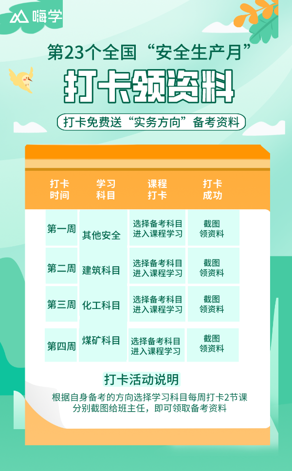 只要每周学习两节课并发送打卡截图给班主任,就能免费领取嗨学独家研发的2024年注册安全工程师实务各科目《通考手册》。这本手册不仅包含了各科的考试重点、难点和解题技巧,还有丰富的模拟题和真题解析。相信有了它的陪伴,你的备考之路将更加顺畅!
