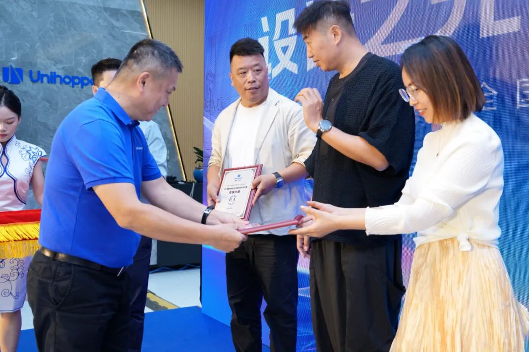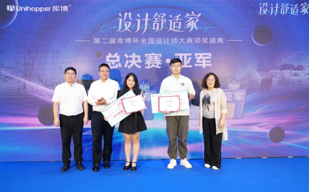 Unihopper库博集团董事长兼总裁潘晟先生和高定观察网红达人、广州易构易家具设计有限公司总经理吴庆阳校长,为评委代表李永新先生、高敏女士、陶振晖先生、刘爽先生授予了“库博杯设计师大赛特聘专家评委”的荣誉牌匾。