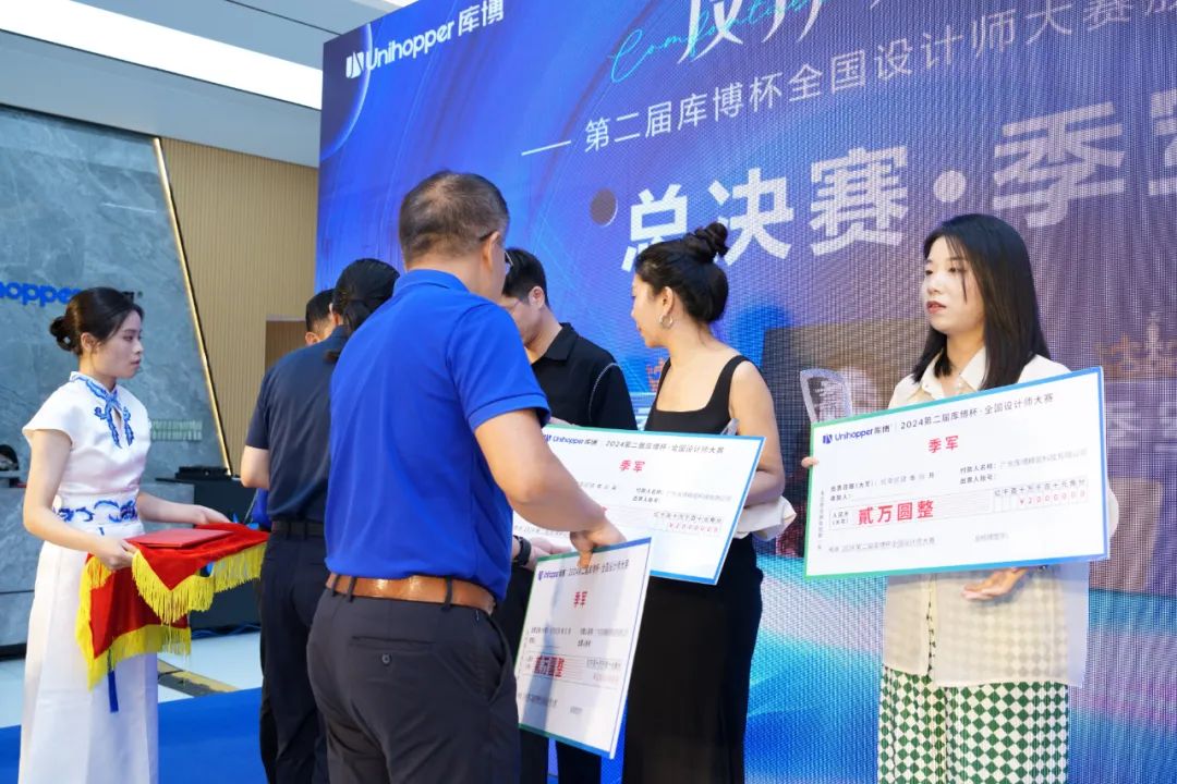 全联家具装饰业商会副秘书长、家居数字化创新研究院执行院长明占喜先生,库博集团董事长兼总裁潘晟先生,库博集团副总裁兼财务中心总经理黄莉女士,共同揭晓了全国冠军获得者,并为获奖者颁发荣誉奖杯、荣誉证书和10万元现金支票。佛山卫浴协会秘书长刘文贵先生、广东欧派集团mifom事业部总经理张劲松先生、百利集团副董事长梁敏宁女士,上台揭晓了全国亚军获得者,并为获奖者颁发荣誉奖杯、荣誉证书和3万元现金支票。