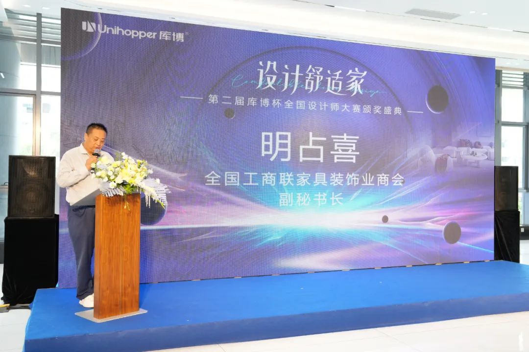 全联家具装饰业商会副秘书长、家居数字化创新研究院执行院长明占喜先生,中国泛家居网红联盟主席、旦哥同创汇创始人刘学旦先生,泛家居圈创始人周忠老师,中国注册高级室内设计师、国家注册高级陈设艺术设计师高敏女士先后上台致辞。嘉宾们表示,库博公司作为中国家居五金行业的佼佼者,一直致力于推动设计行业的发展和创新。本次大赛的举办,不仅为设计师们提供了一个展示才华、交流思想的舞台,也为家居行业注入了新的活力与动力,推动了行业的持续进步和发展。全联家具装饰业商会副秘书长、家居数字化创新研究院执行院长明占喜先生