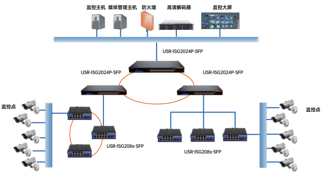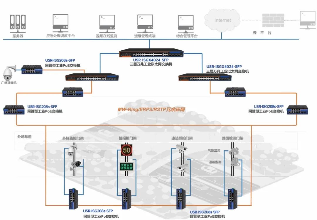 使用万兆+千兆工业环网交换机进行组网及业务接入,基于ERPS的电信级50ms自愈环网,对安防摄像头等终端设备进行业务接入和保护。