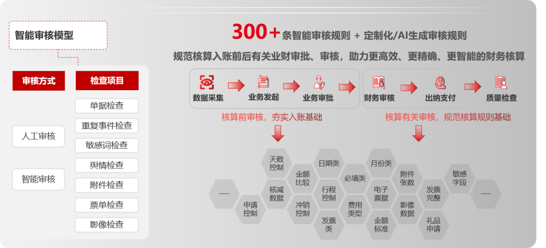 通过将核算入账有关的审核规则嵌入系统,完成高效、精准的审核,从业务前端开始规范审核,为财务数据质量提升奠定基础。并可以根据企业个性化管理要求,基于不同的行业、不同准则对应的不同核算规则自定义稽核规则,对核算前后的审核异常问题实时提醒,又快又准定位错误原因,实现零误差,零失误。