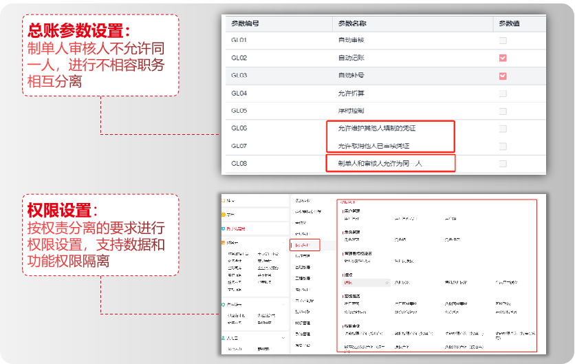 通过参数和权限设置,进行职责分离和授权管理,将不相容职务分离的内控要求通过系统实现。